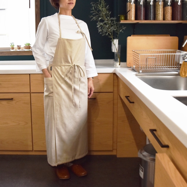 前の部分が2枚重ねになっているので、足を広げたりしゃがみ込む動作が楽にできるエプロンです。 両足の裾の紐を絞って結べばパンツの様に足にフィットしますので、膝をつく作業などにも便利です。 片側の裾の紐を絞って、胸当のループに結ぶと収穫袋の様な大きなポケットになります。 大きめのポケットは横から後ろにかけてついているので、しゃがんだりしても入れたものが邪魔になりません。 ハーフリネンの生地を染色後、生地を引っ張ることなく自然な状態で休めたため くったりとした風合いのある軽い生地です。 リネン特有のネップがあります。 ご家庭でお洗濯できます。ネットに入れて単独でのお洗濯をおすすめします。 ※3枚目以降は色違いの着画となります。 SIZE:M~L(広げた寸法:w1080/h1000) 素材:リネン55% コットン45%(日本製)キャンバス