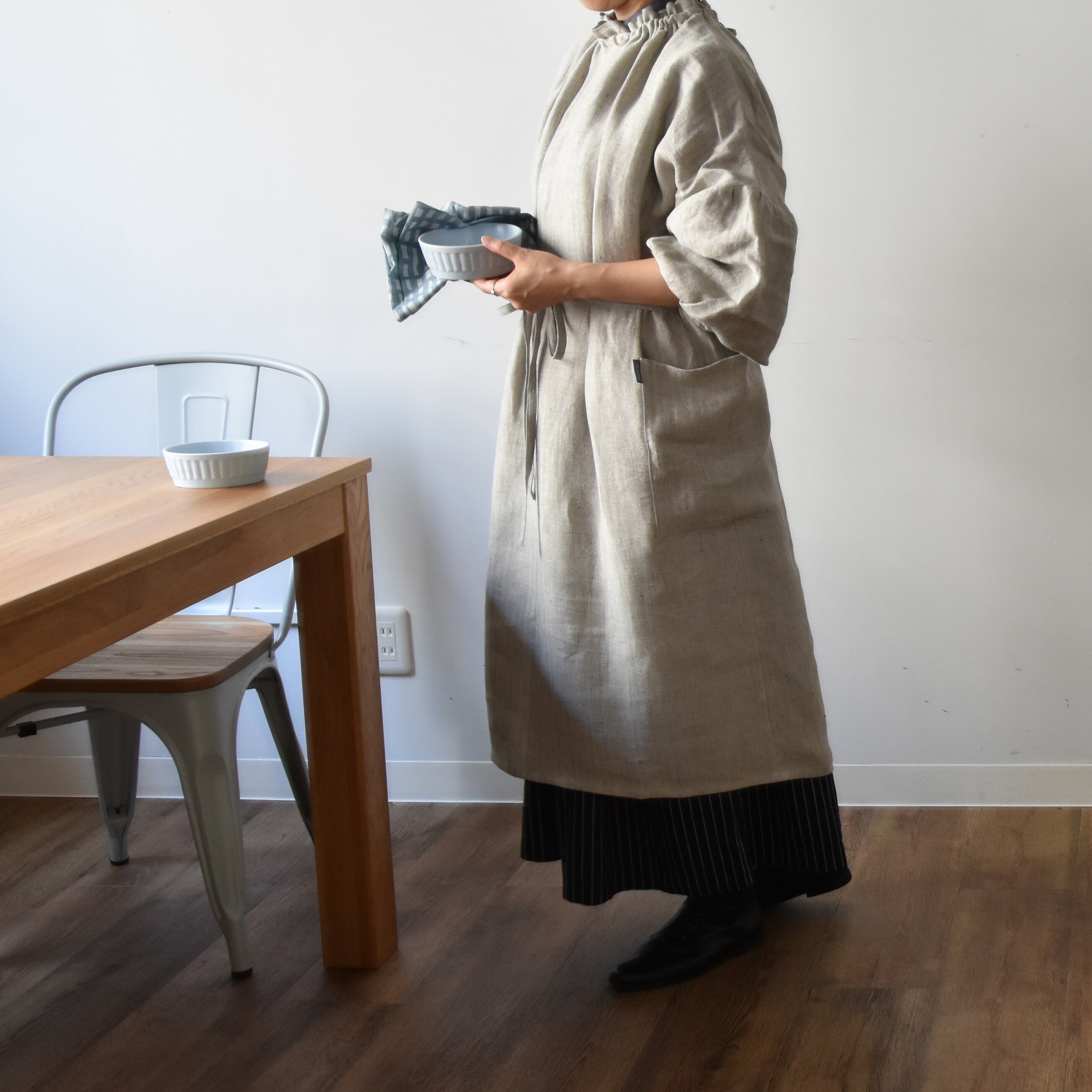 割烹着の様に前から袖を通して首元の紐を結べば、すっきり割烹着風。