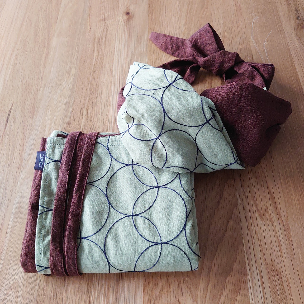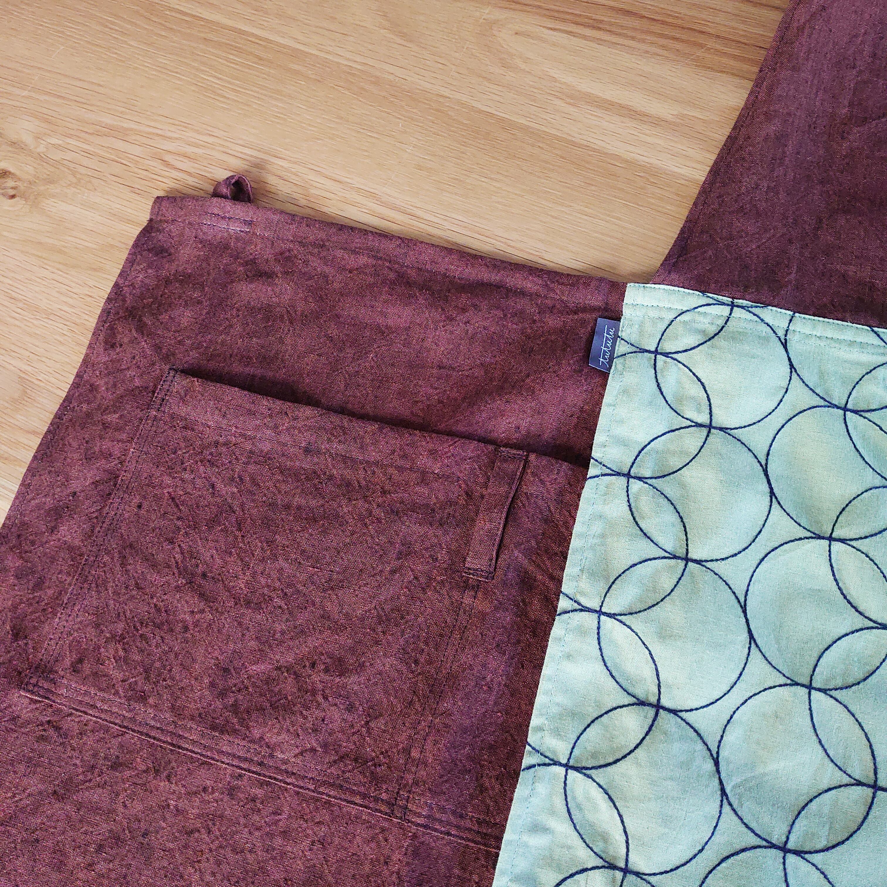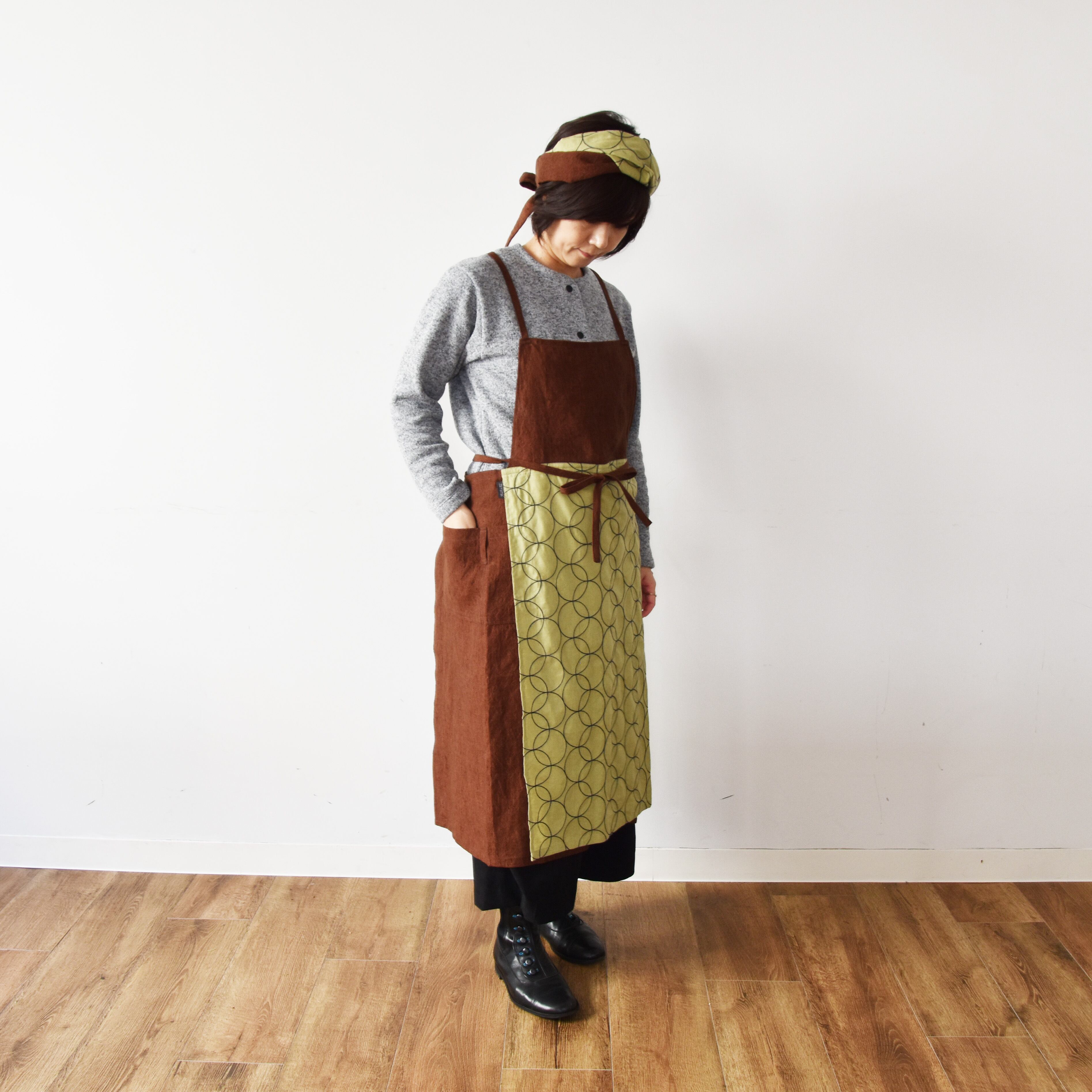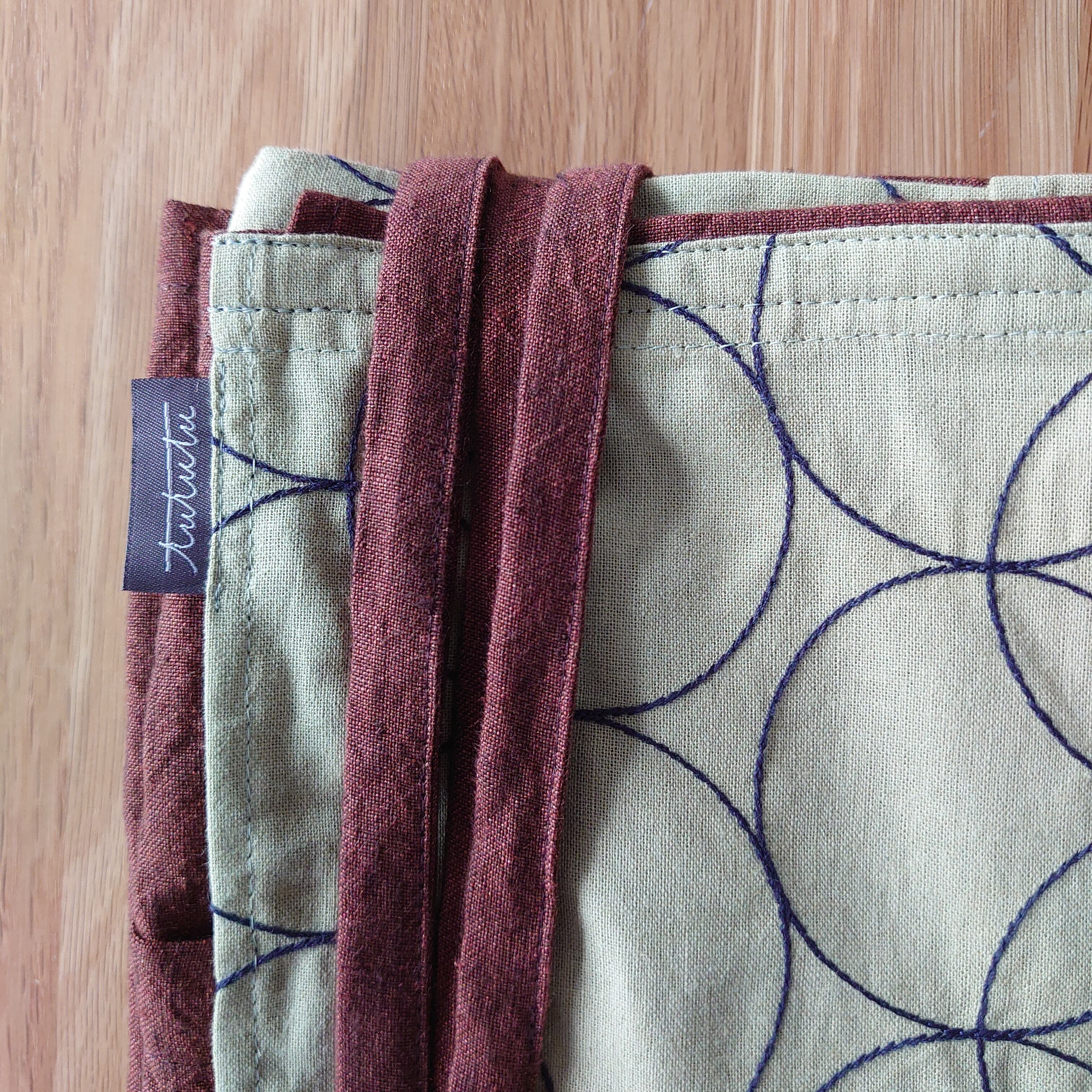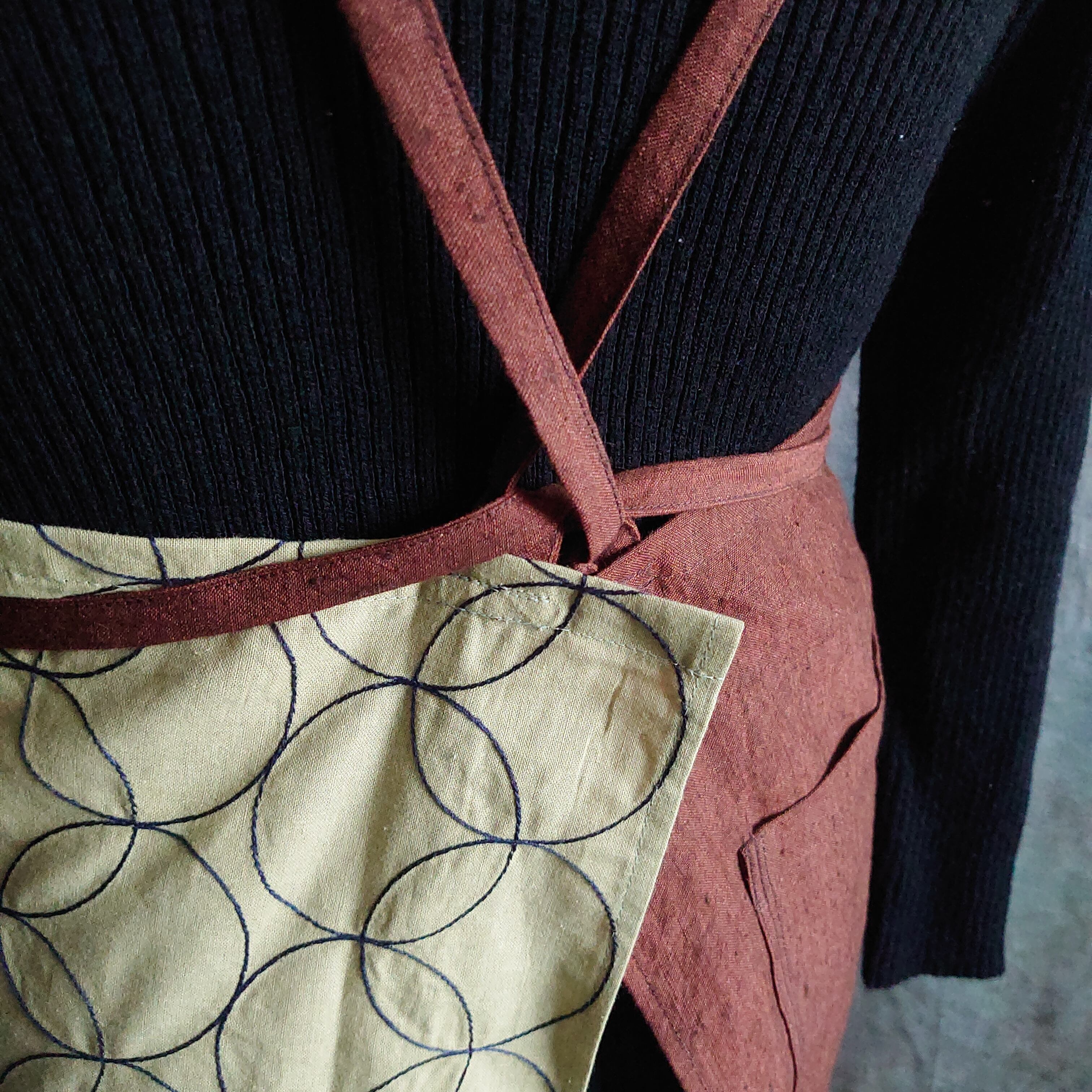 サークル模様の刺繍が施されたコットンリネン生地と少し黒の糸が織り込まれたような立体感のあるレンガ色のリネン生地の組合わせです。