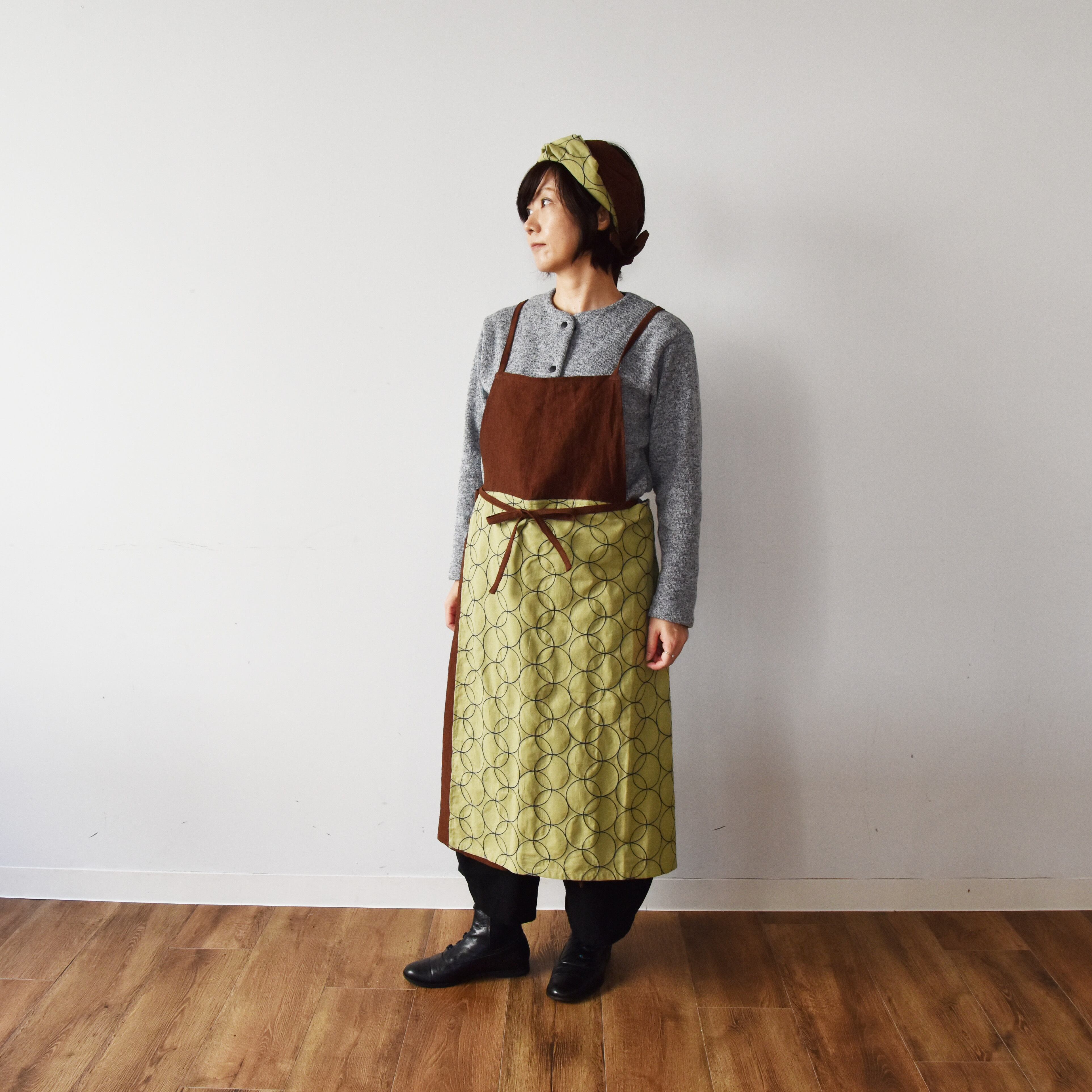 前の部分が2枚重ねになっているので、足を広げたりしゃがみ込む動作が楽にできるエプロンです。
