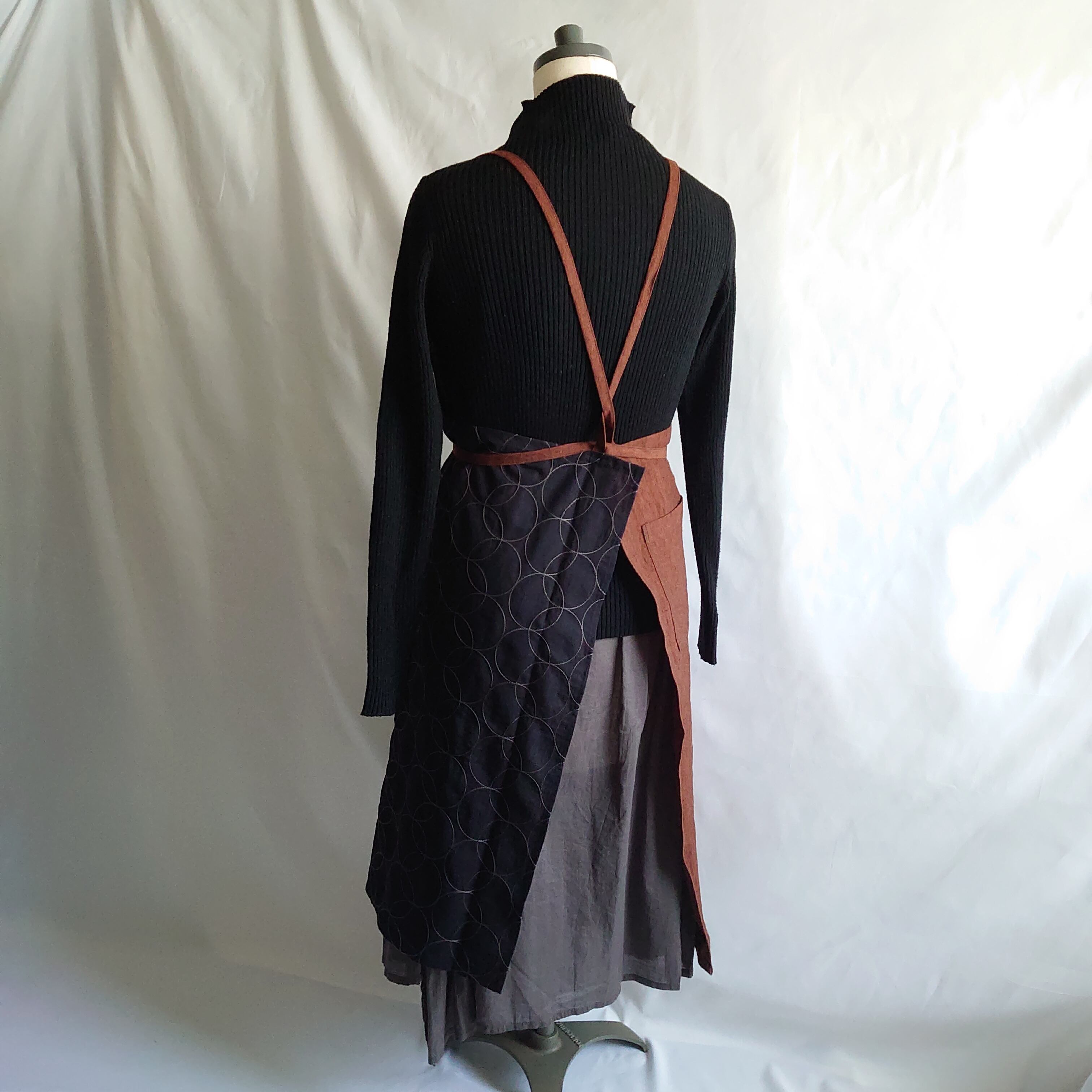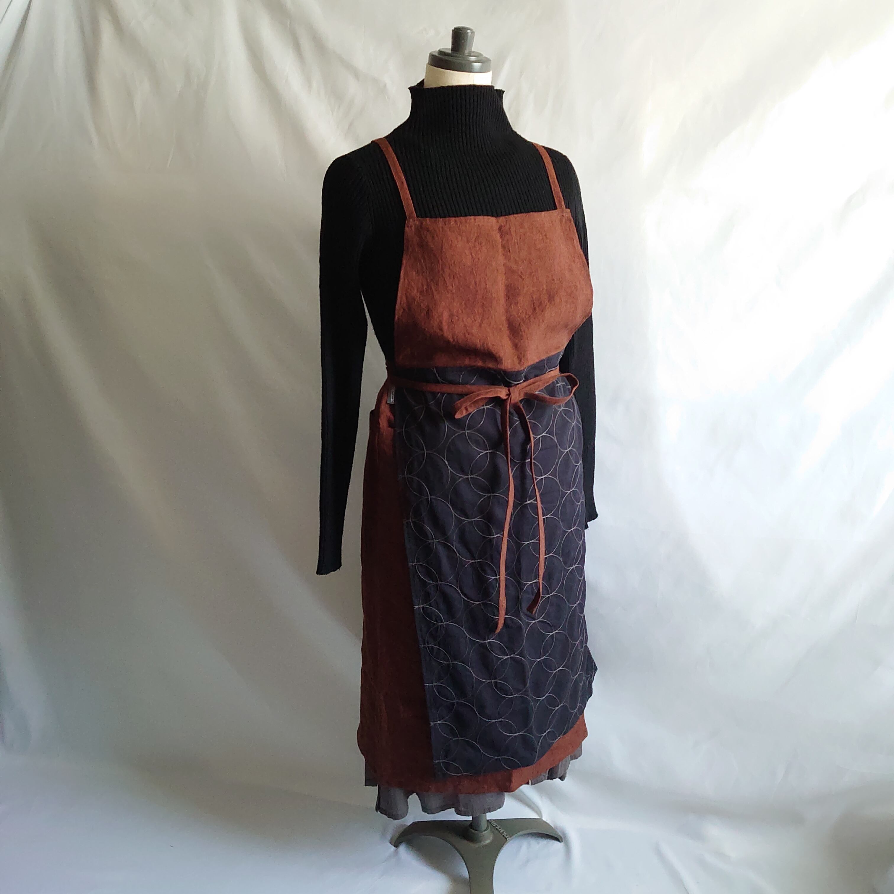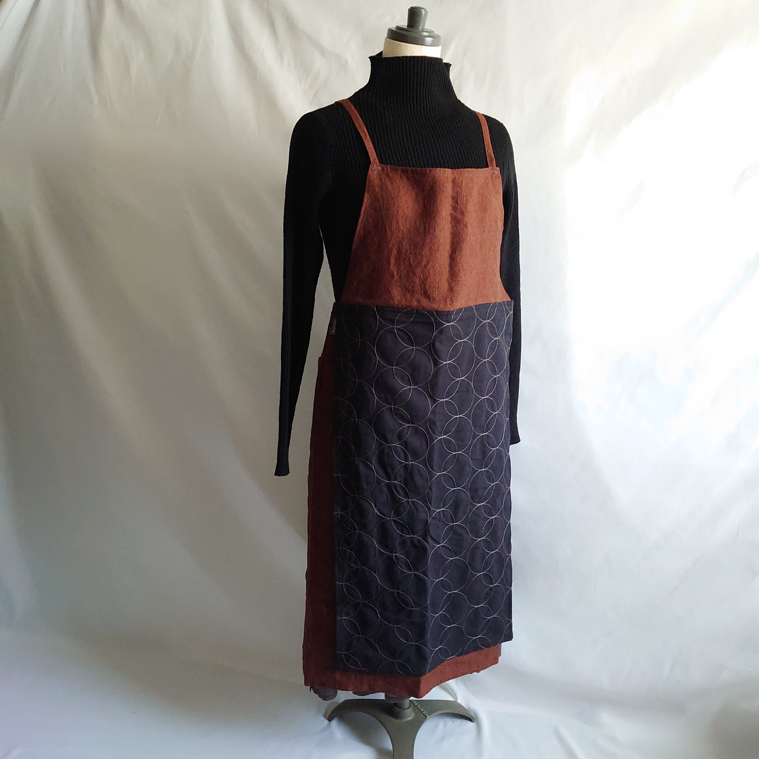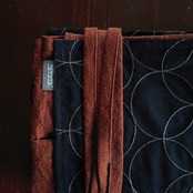 サークル模様の刺繍が施されたコットンリネン生地と少し黒の糸が織り込まれたような立体感のあるレンガ色のリネン生地の組合わせです。