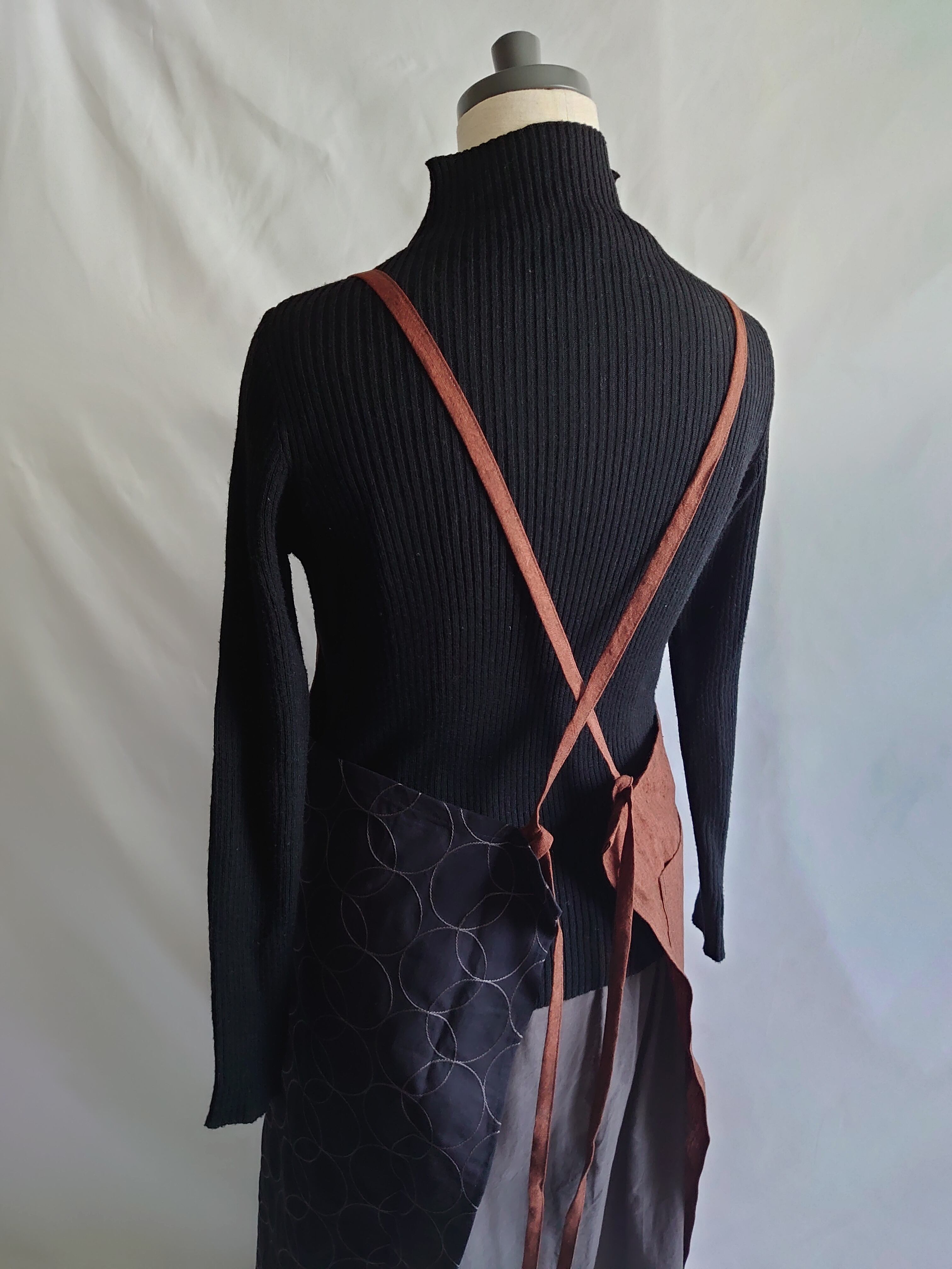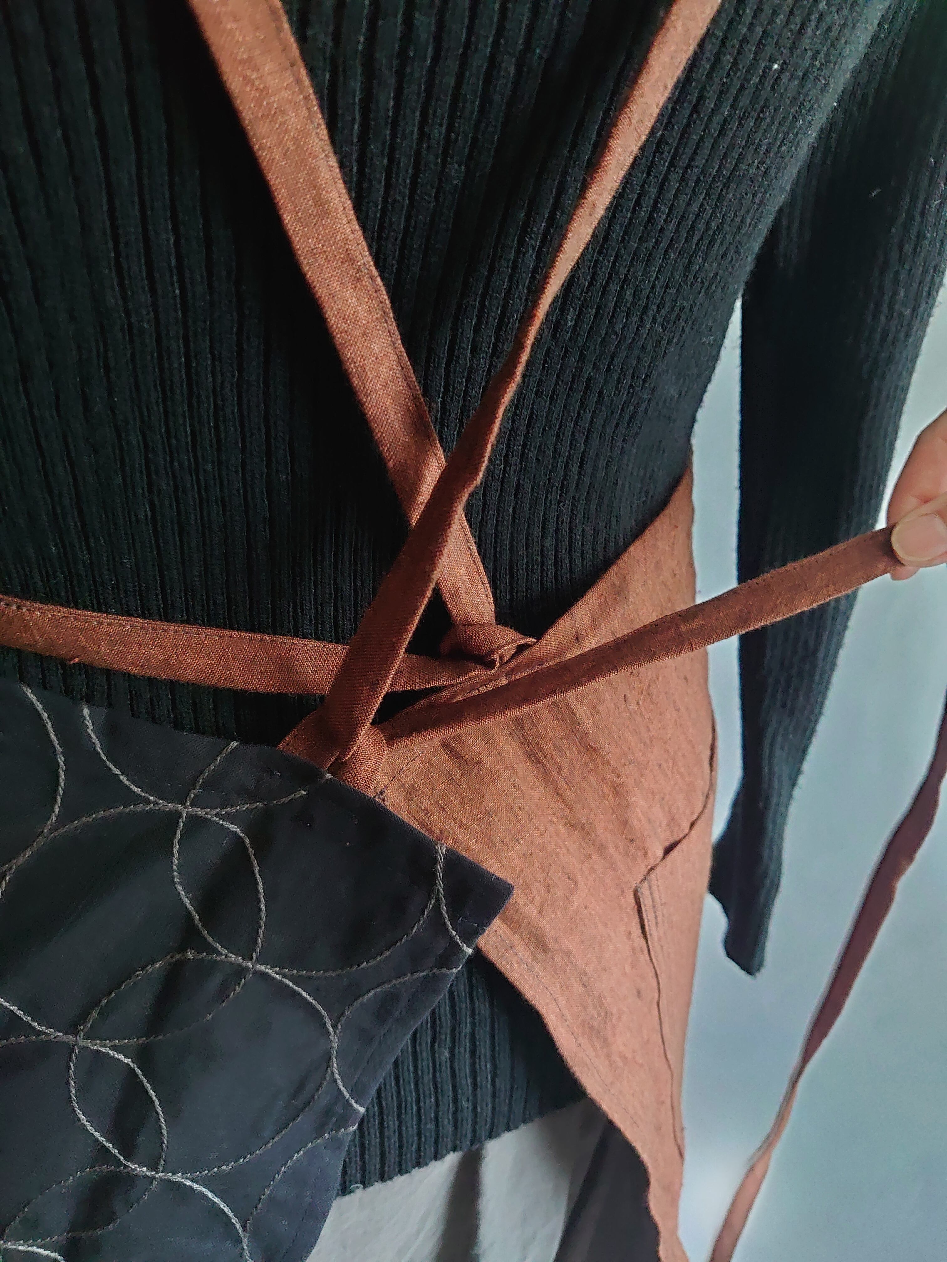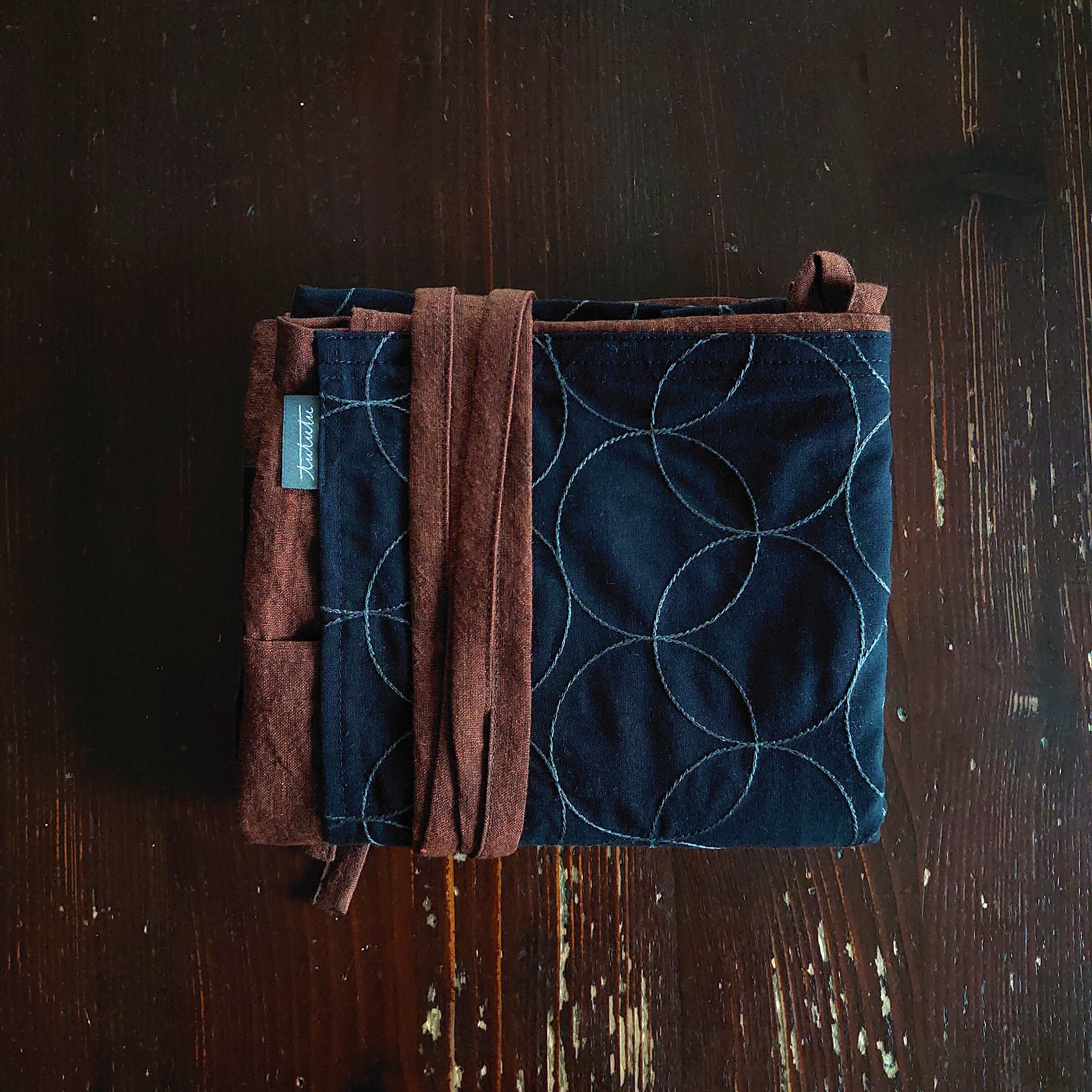 サークル模様の刺繍が施されたコットンリネン生地と少し黒の糸が織り込まれたような立体感のあるレンガ色のリネン生地の組合わせです。