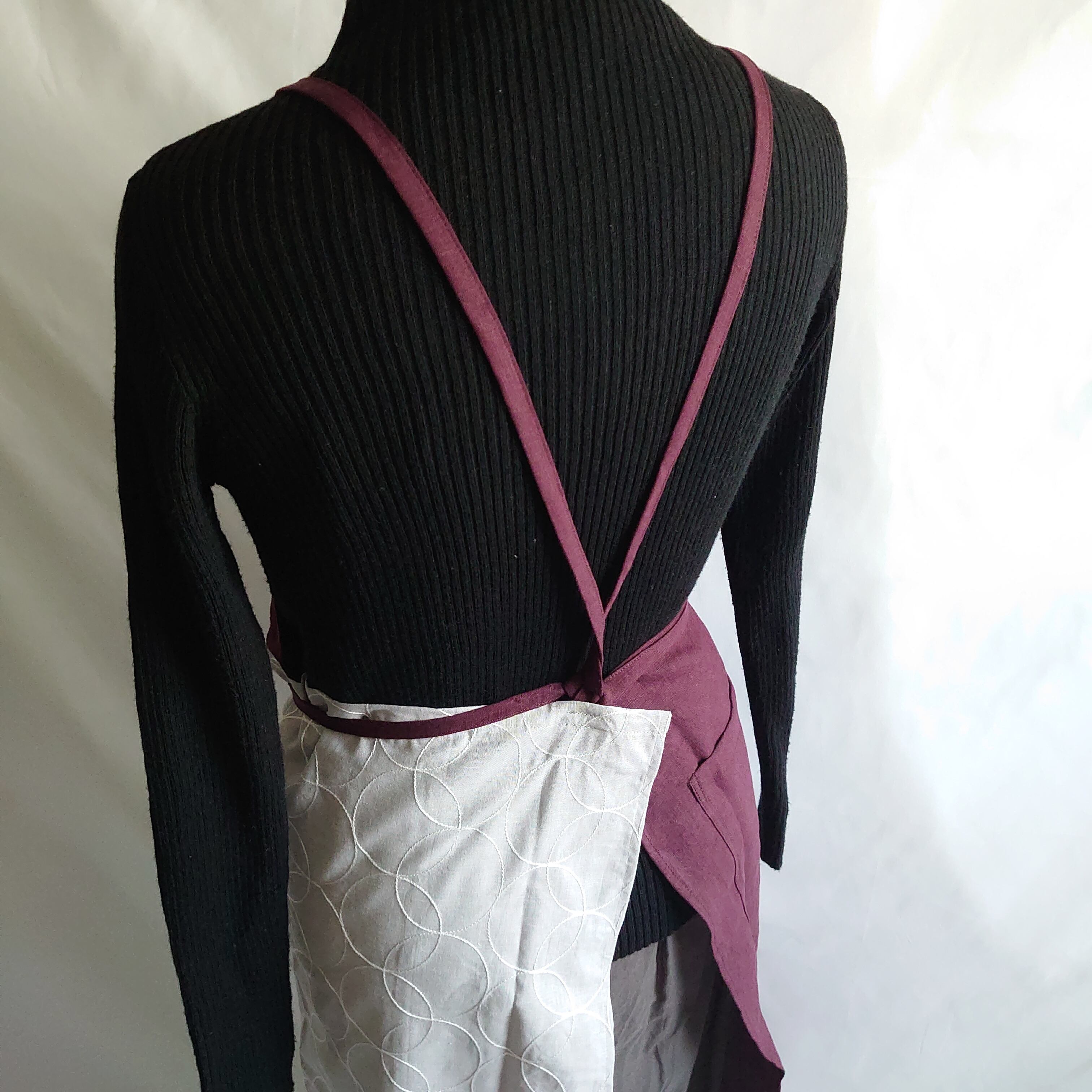 前の部分が2枚重ねになっているので、足を広げたりしゃがみ込む動作が楽にできるエプロンです。
