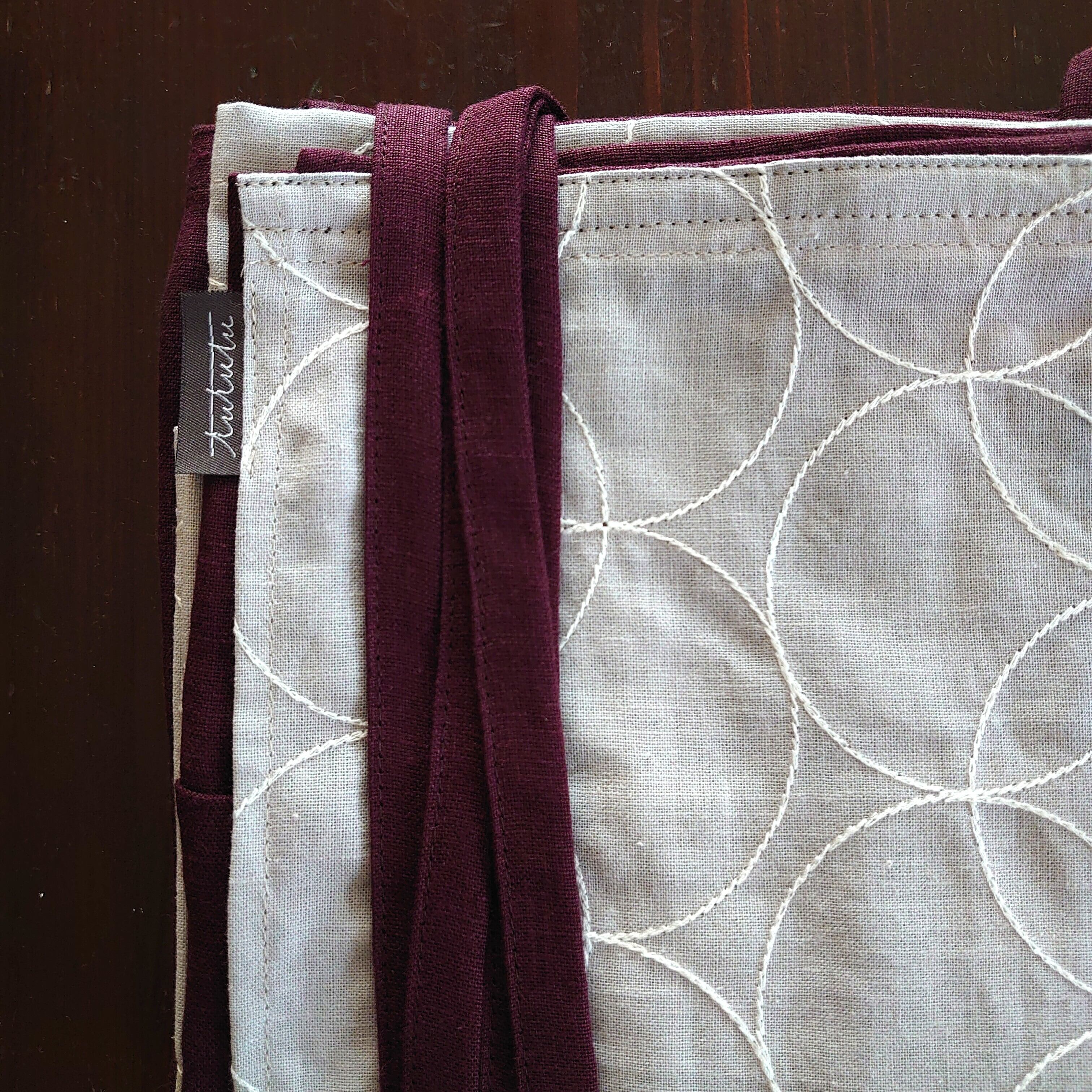 サークル模様の刺繍が施されたコットンリネン生地と少し黒の糸が織り込まれたような立体感のあるレンガ色のリネン生地の組合わせです。