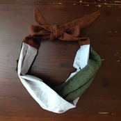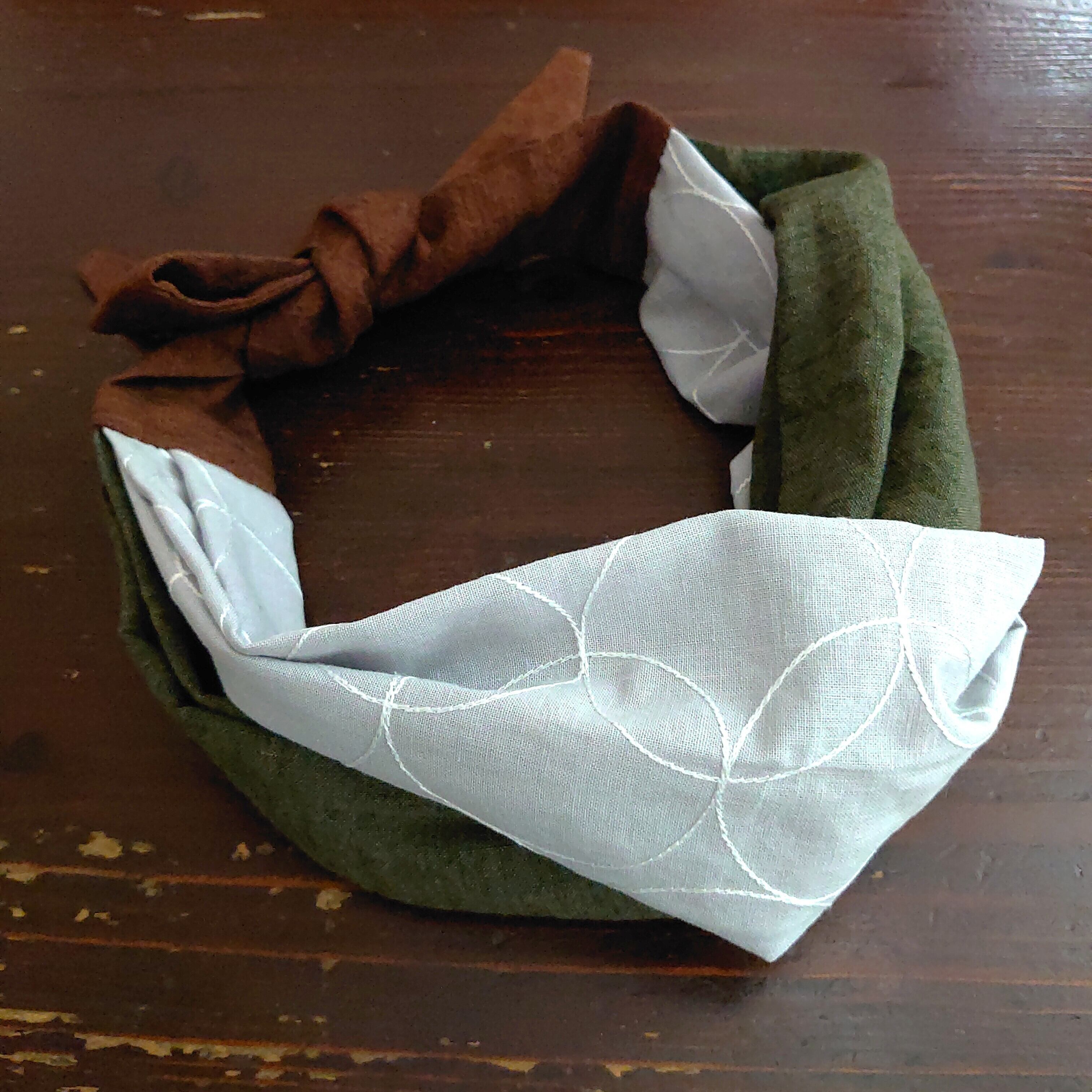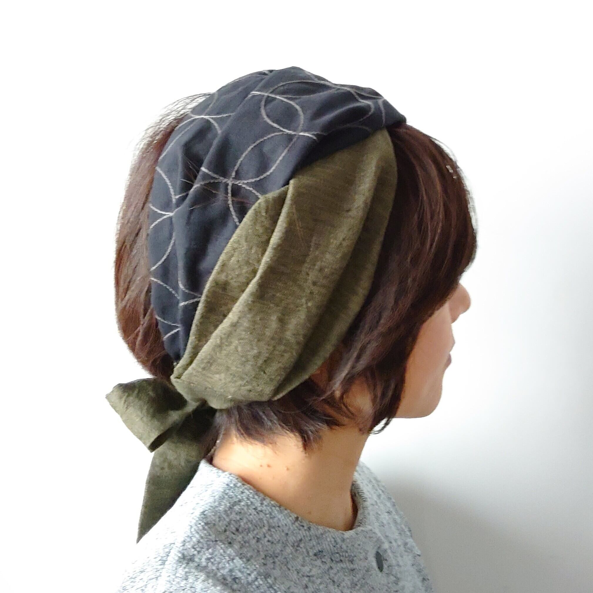 リボンねじりターバン/リネン・コットンリネン レンガ・グリーン・ライトグレー刺繡