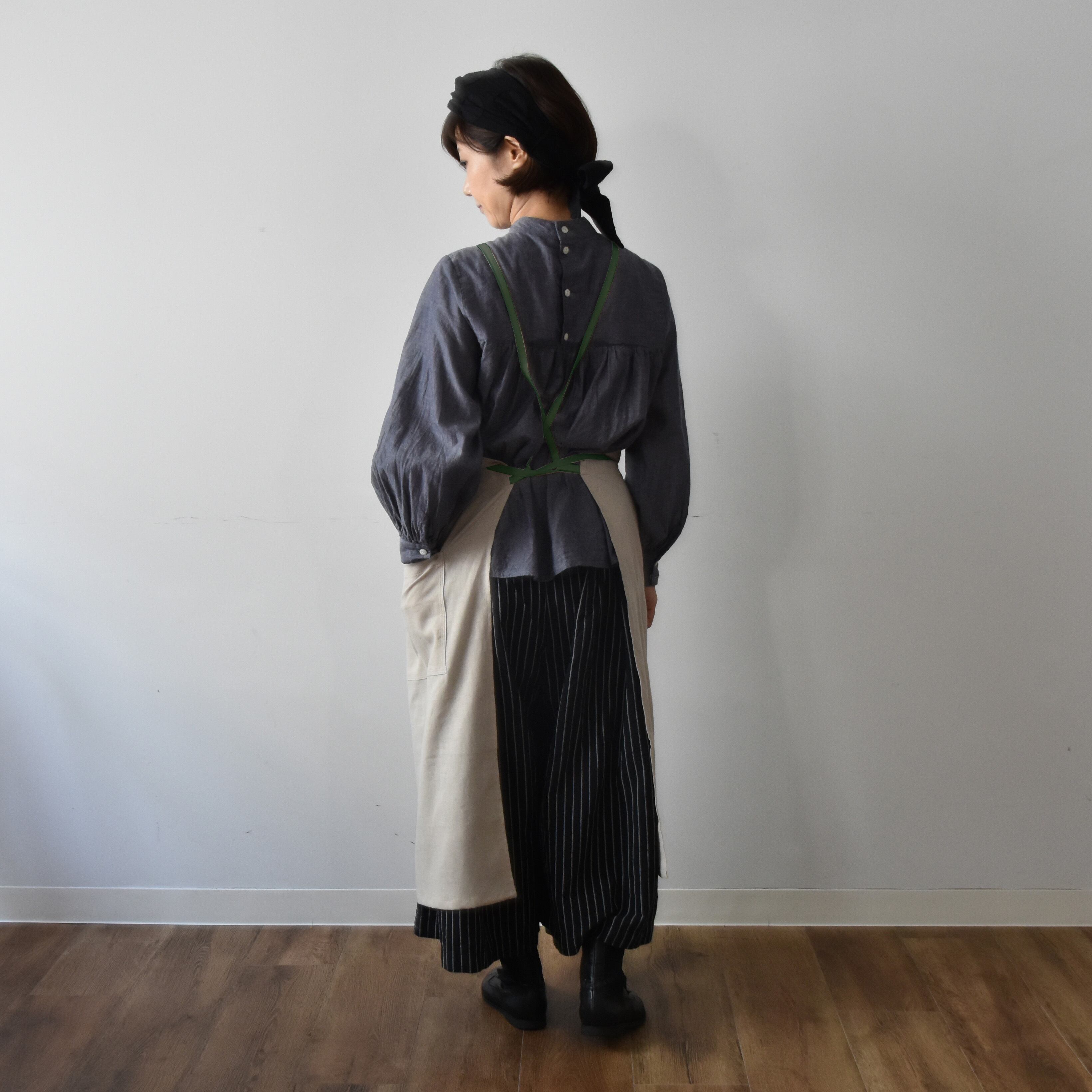 着るとたっぷりとしたギャザーがありますが、広げた時にはギャザーがないので、お洗濯やアイロンがけがらくらく。
