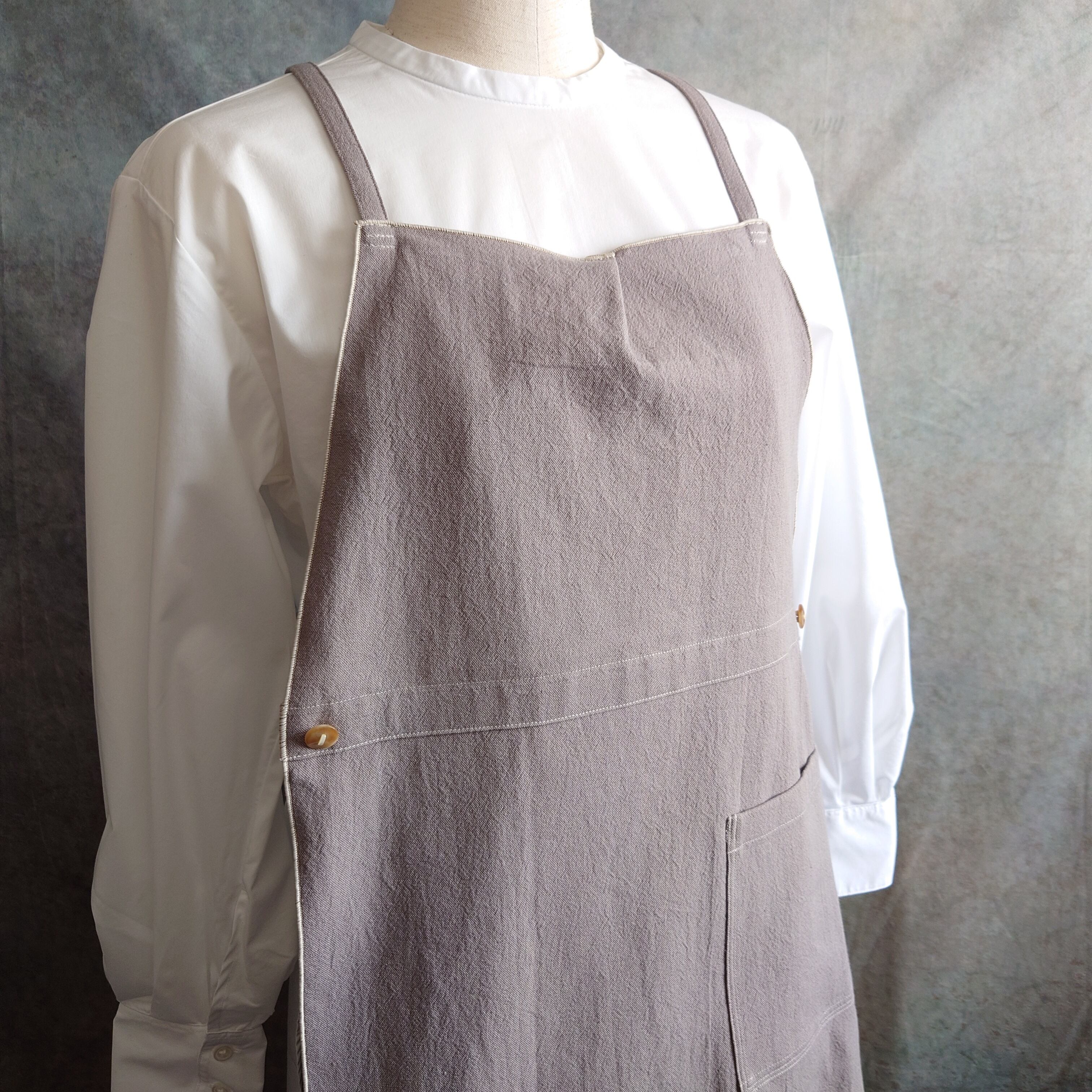肩ひもがついた本体と、別売りの前部分が、ボタンのつけ外しで分かれるので、お好みで組み合わせを選べ、オリジナルエプロンにすることができます。