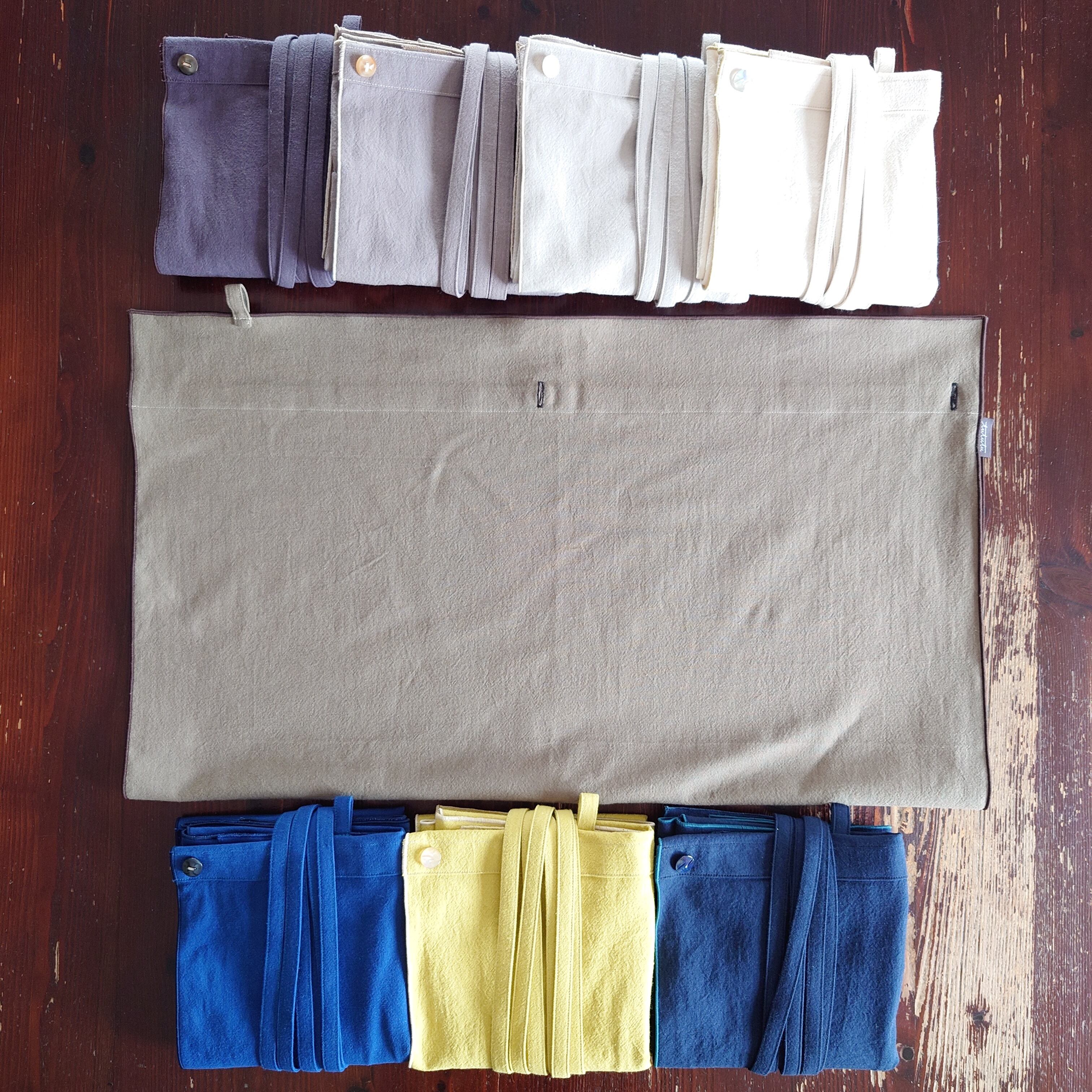 例えば、このエプロンが2セット(本体2枚、前部分2枚)あれば、4パターンのデザインをお楽しみいただけます。