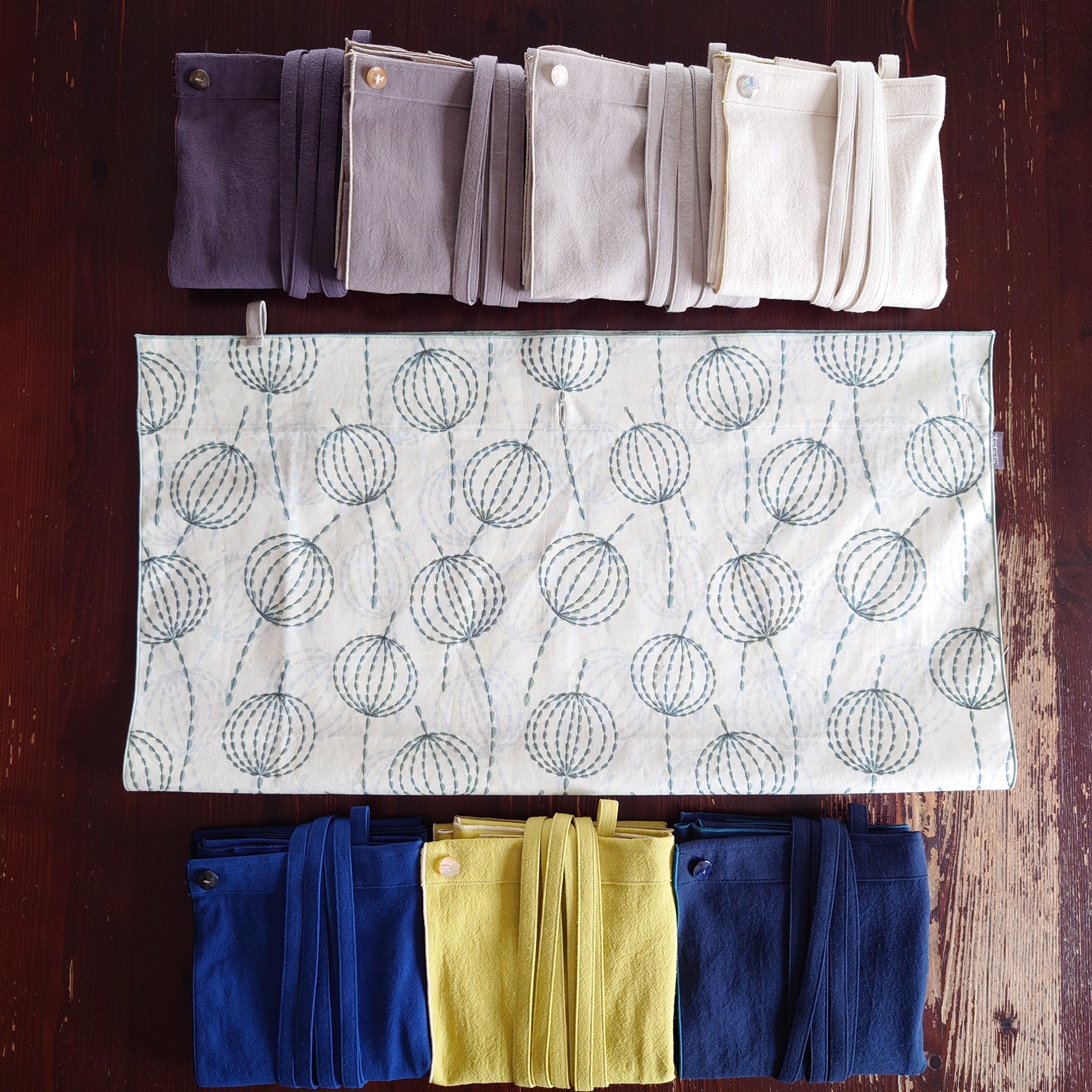 例えば、このエプロンが2セット(本体2枚、前部分2枚)あれば、4パターンのデザインをお楽しみいただけます。