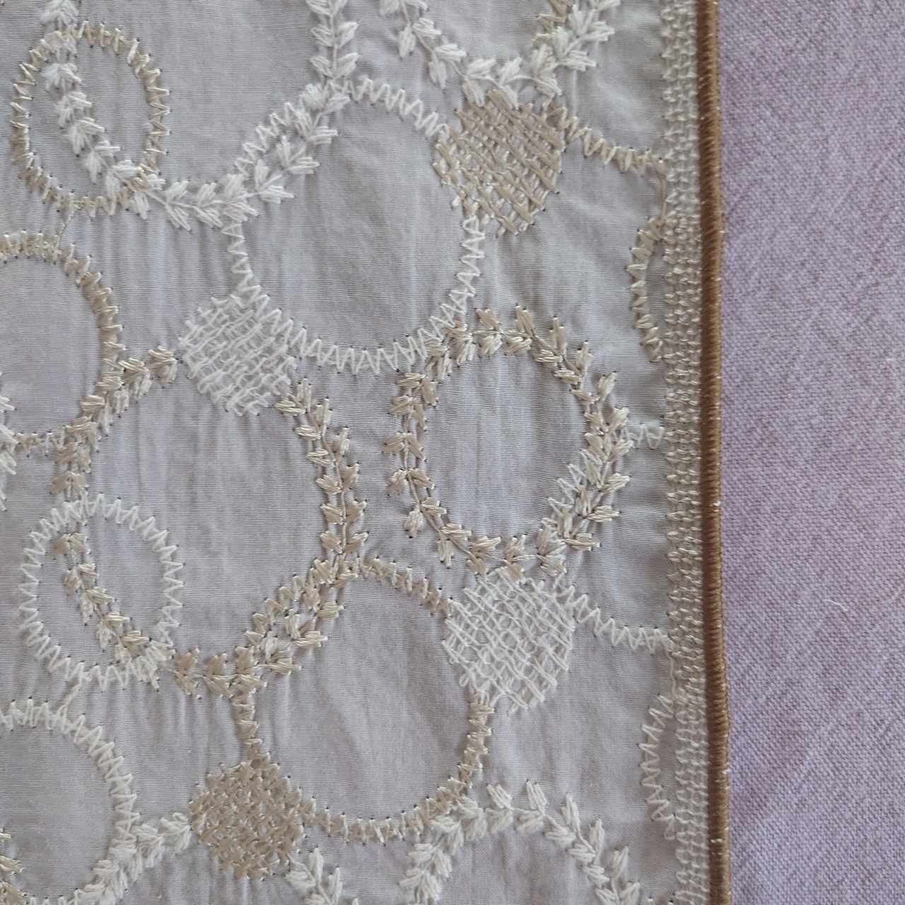 縁取りをロックミシンで巻きロック縫いをしているので、三つ折り縫いをしている部分がなく、軽さがあります。
