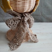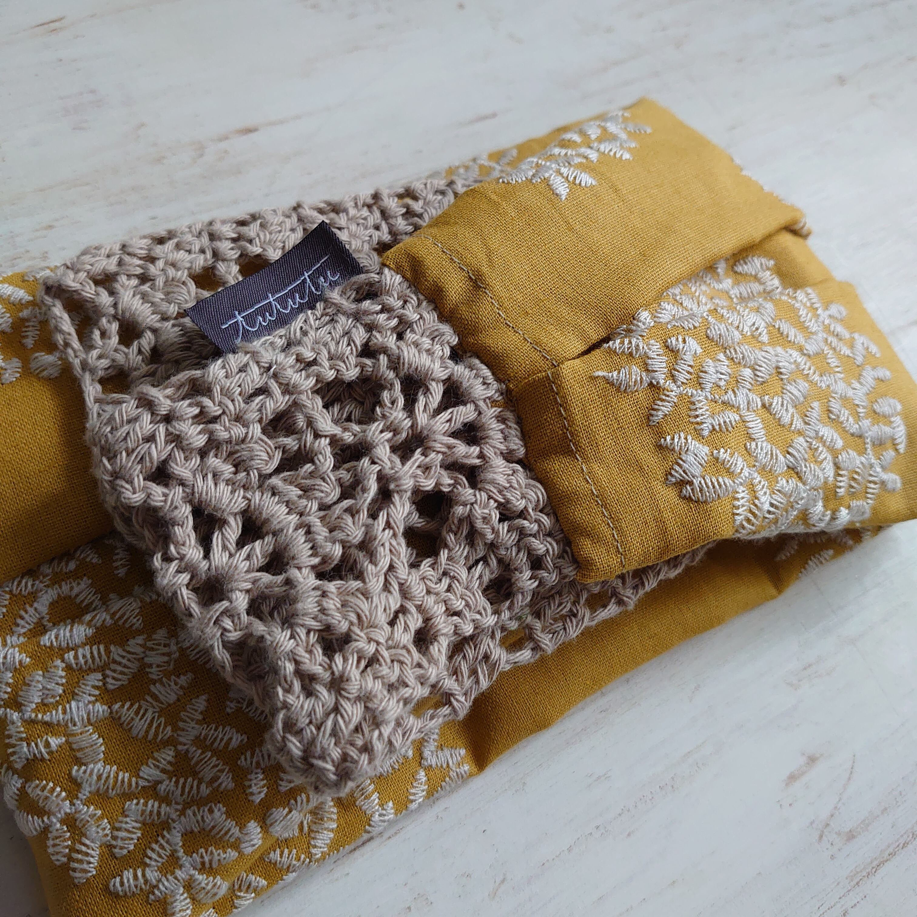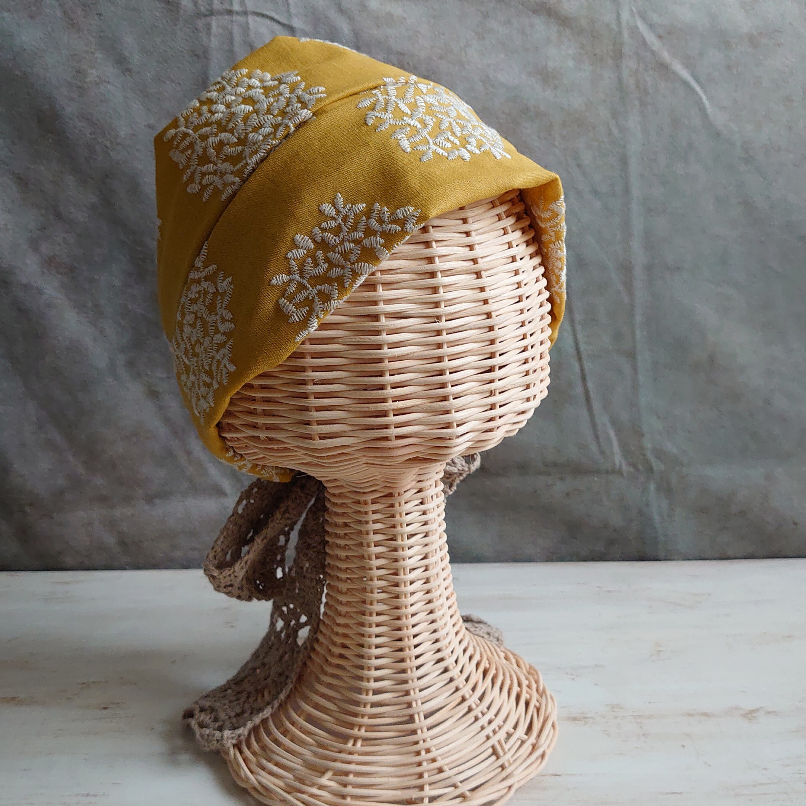 くすんだ黄色地に白いサークル状に刺繍が入った生地と模様編みのリボンで、可愛らしい大人のターバンに仕上げました。