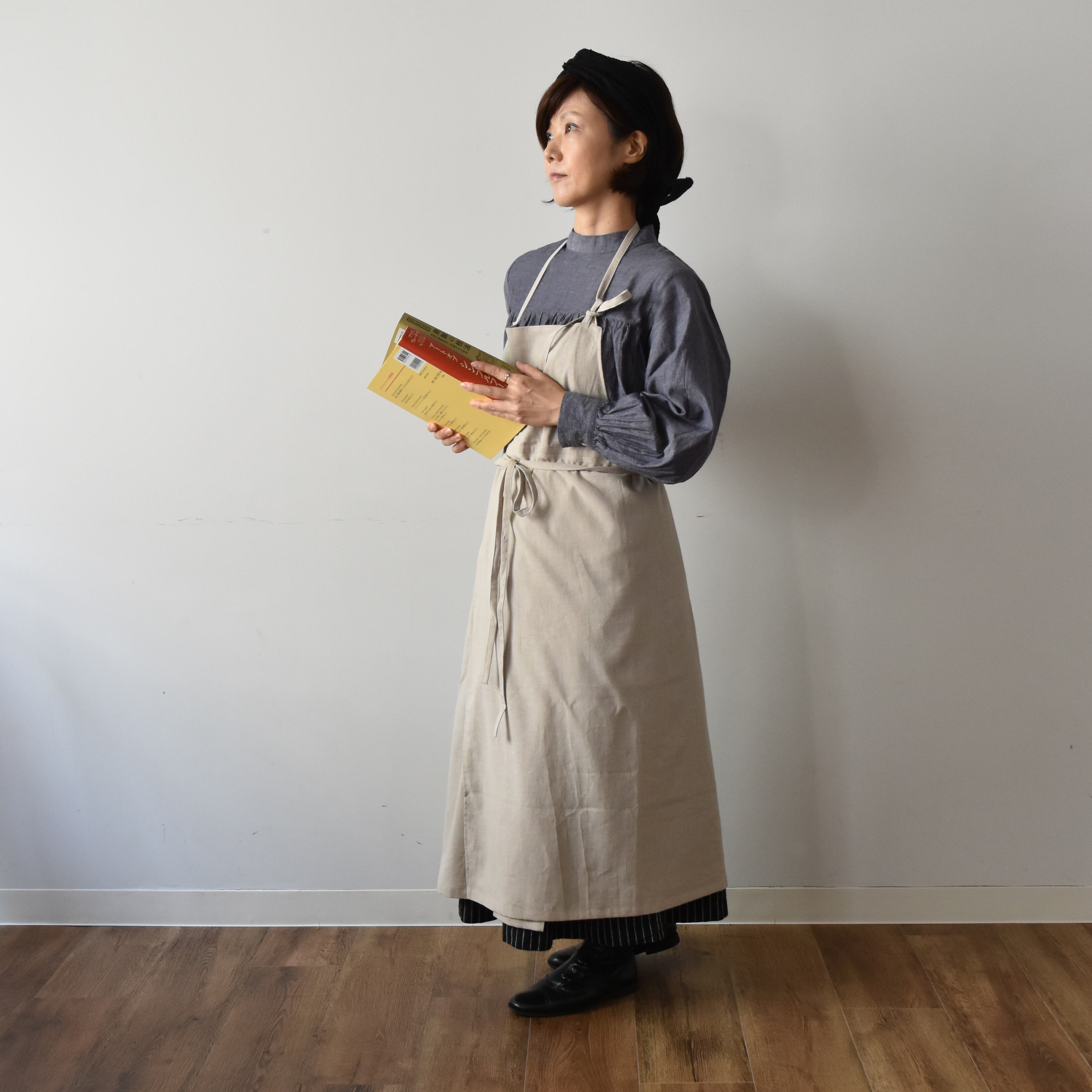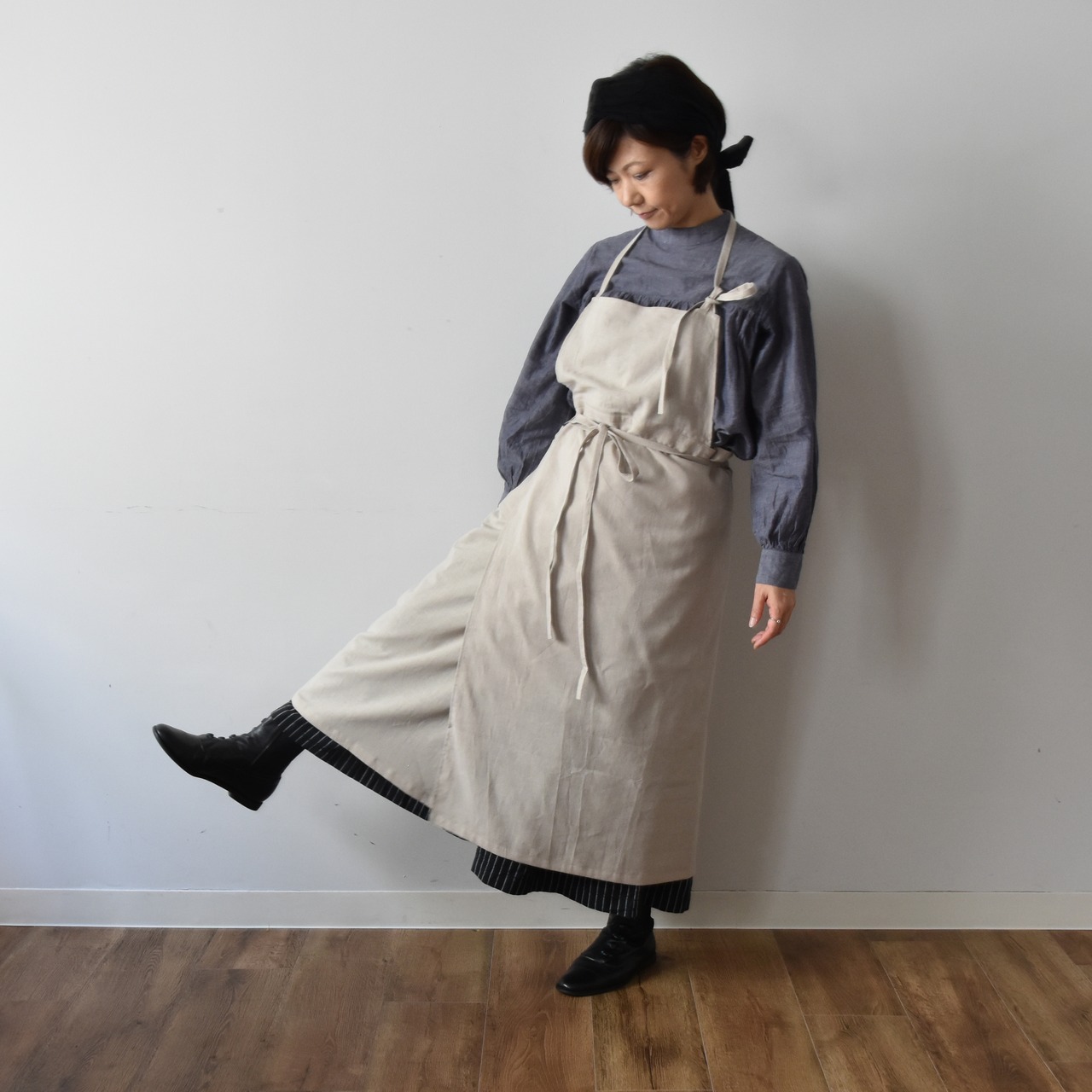 前の部分が2枚重ねになっているので、足を広げたりしゃがみ込む動作が楽にできるエプロンです。
