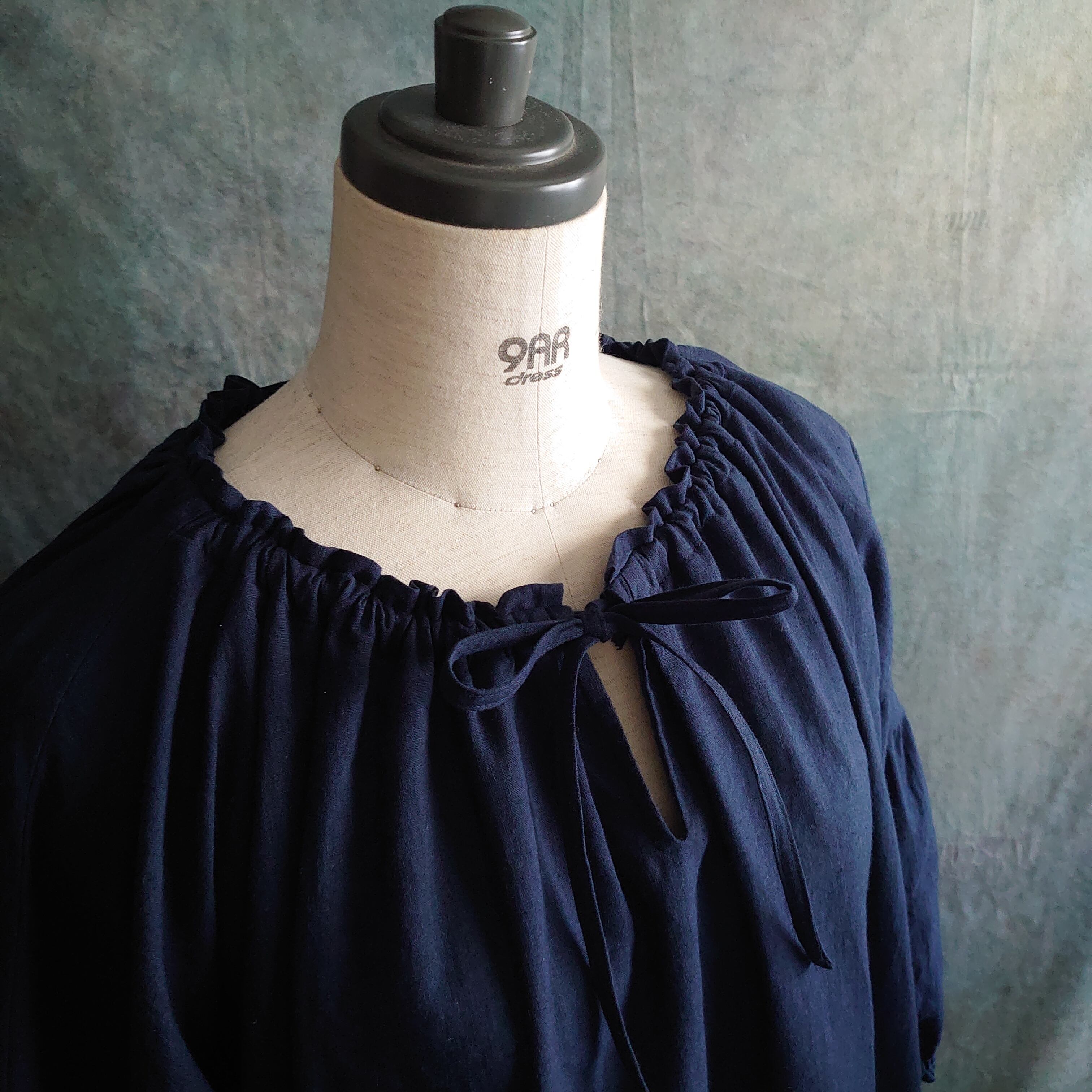 襟元はラフに開けたりキュッと絞ってみたりと紐の結び方でシルエットが変わります。