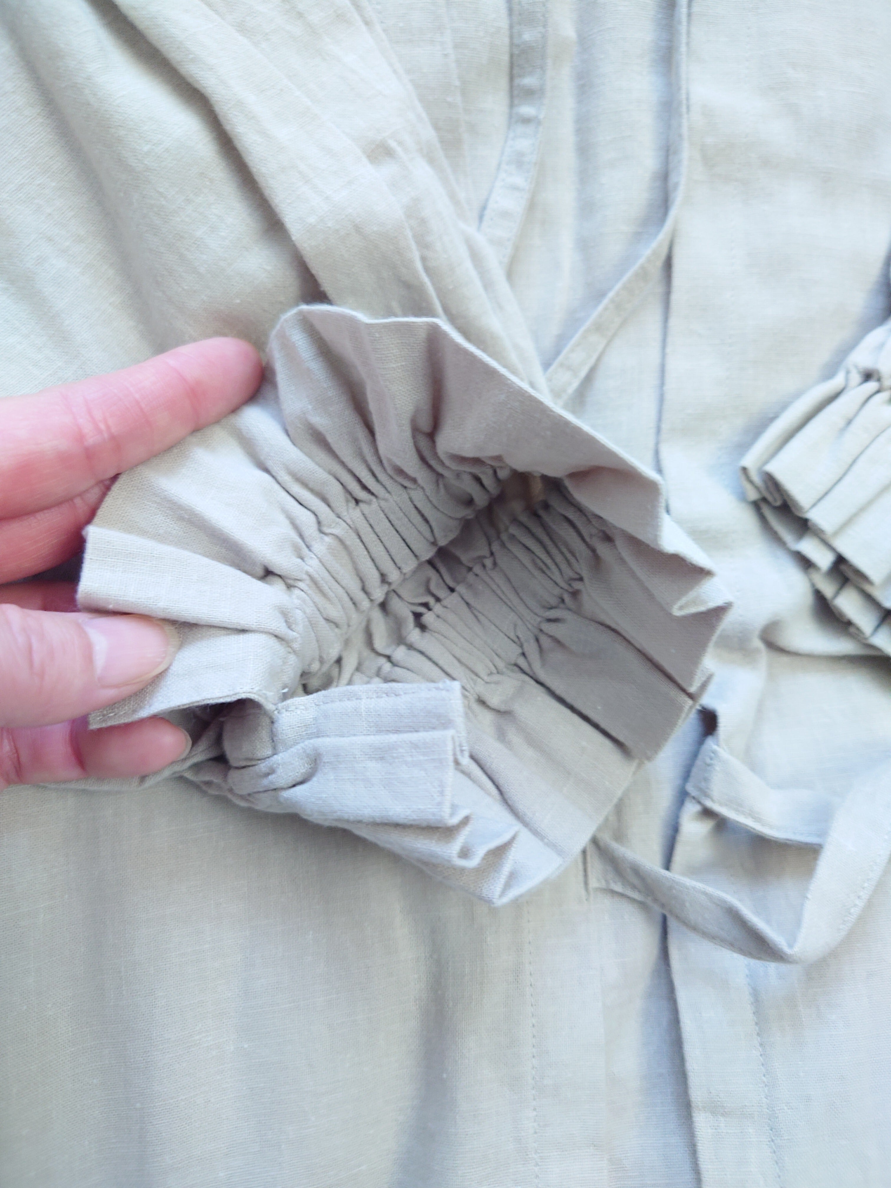 袖口は、少し内側にゴムを通しているので、フリルの様なデザイン。少し短めの袖なので、水仕事などには、下に着用の衣類の袖と一緒にまくりやすくなっています。