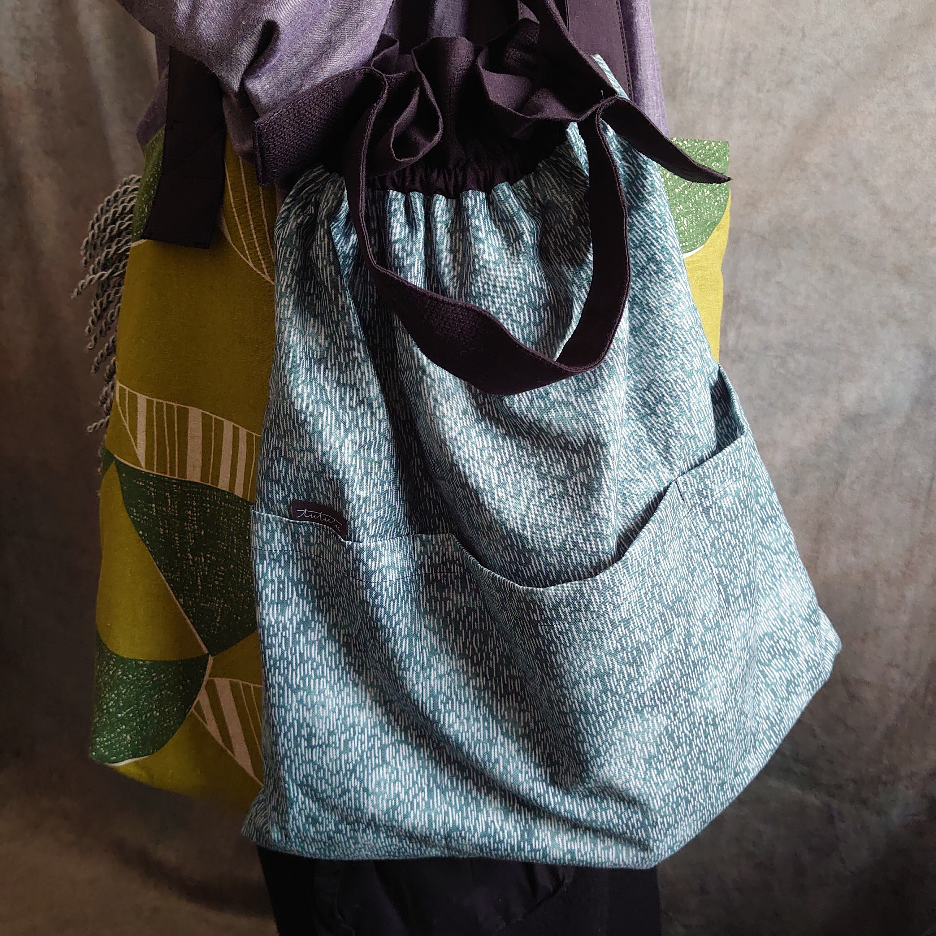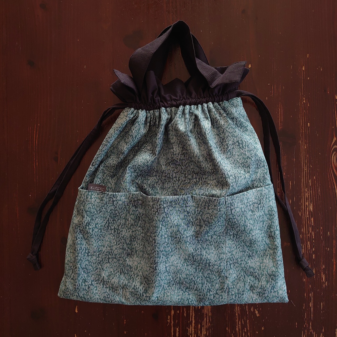 紐を絞って巾着型のバッグとして肩掛けできます。