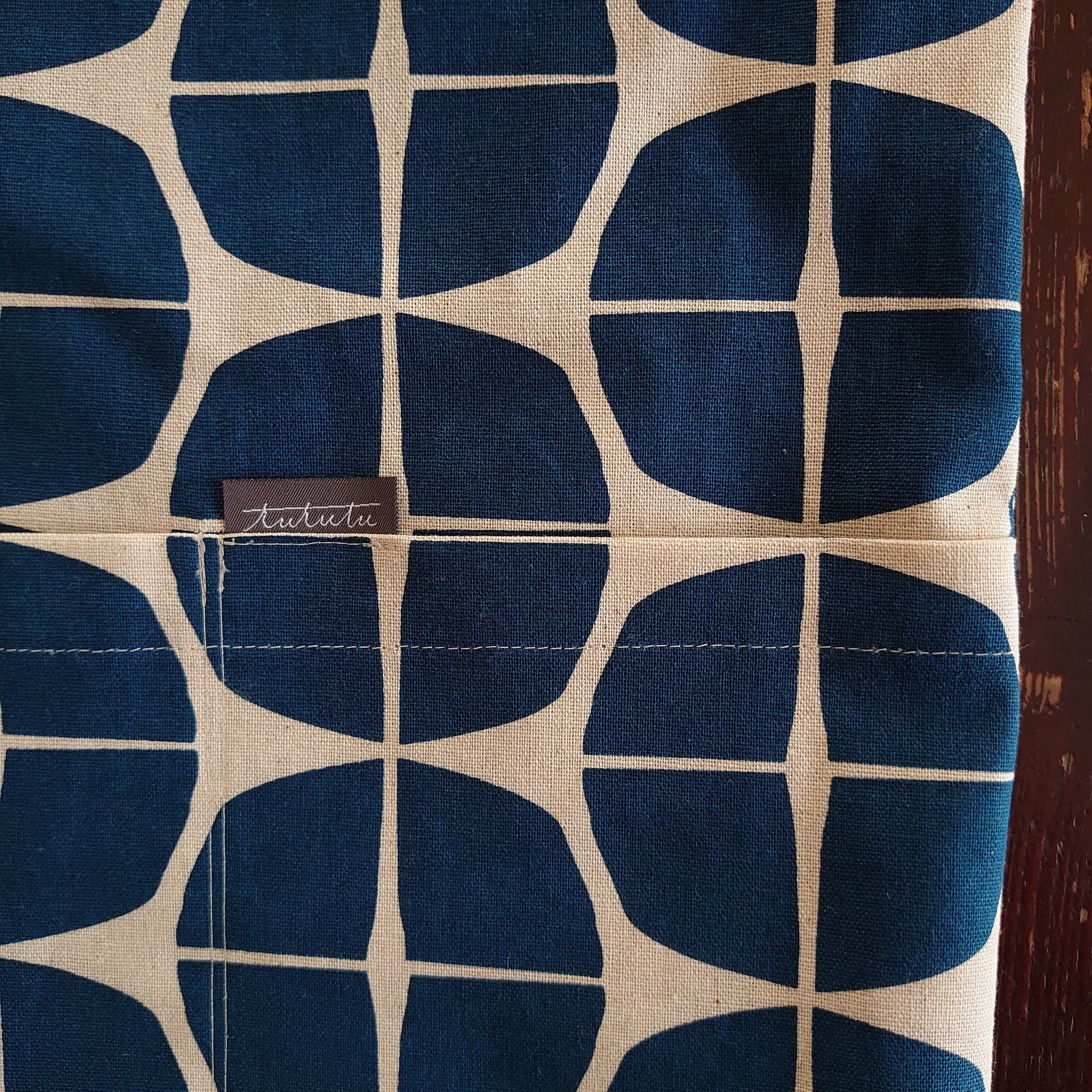 インナーバッグのセットは、インナーバッグを中に入れて、その取手部分にトートバッグの取手を通すだけ。スナップで留めたり、紐で結ぶ必要がないので、脱着が簡単です。