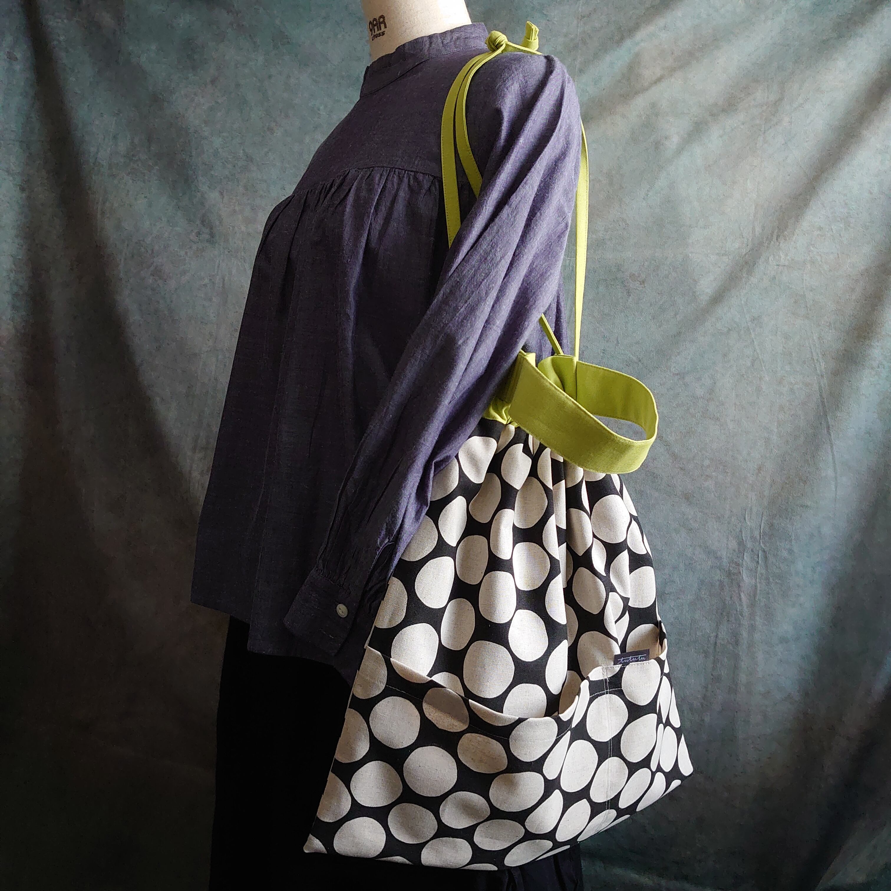 トートバッグをセットする際に通す部分が、紐を絞ると取手になるので、手で持ってちょっとしたお出掛けにも。