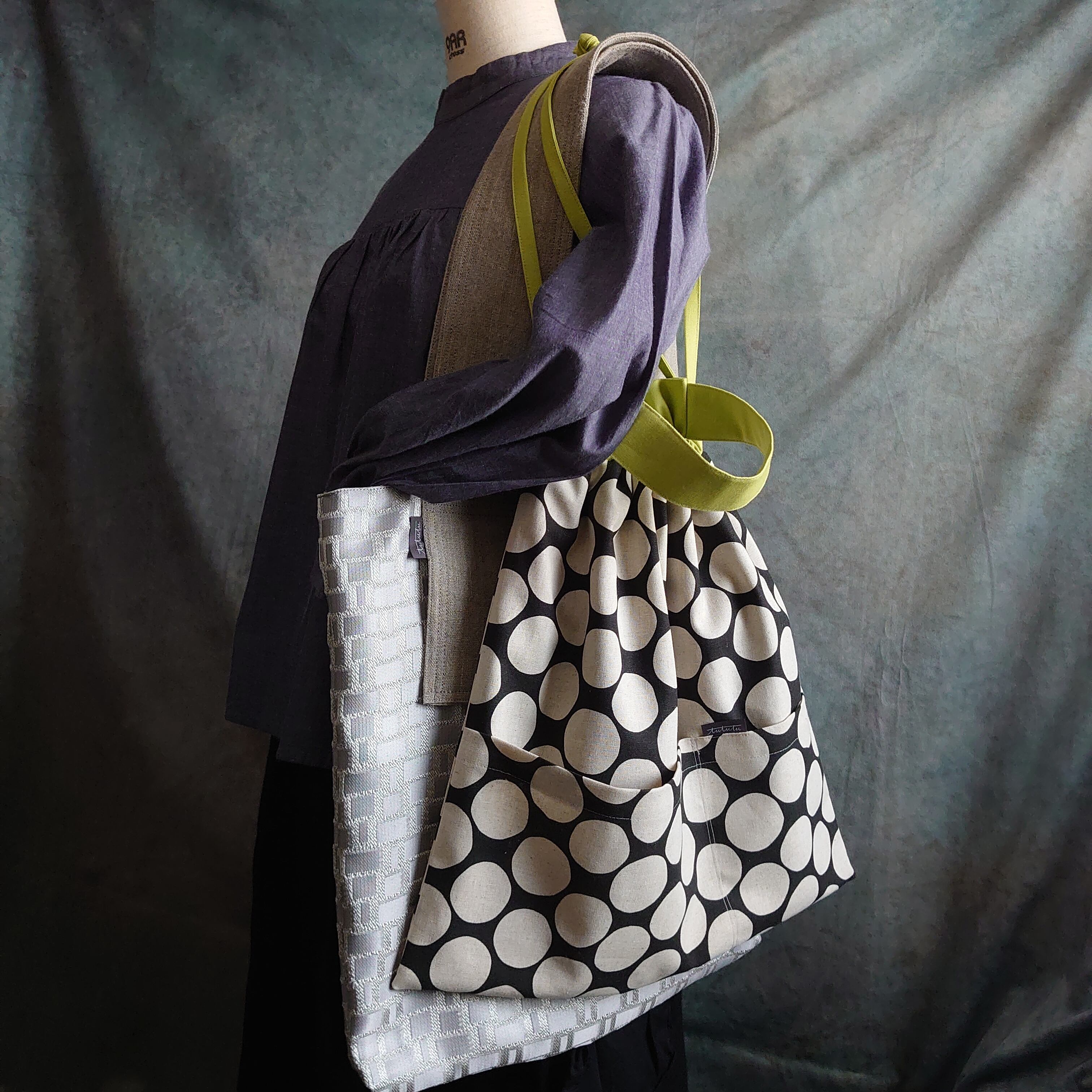 ちらっと見えるインナーバッグの色の組み合わせ方で、トートバッグのデザインもカスタマイズ。カラーの組み合わせと、2個持ちした時の柄の組み合わせを楽しんでお選びください。