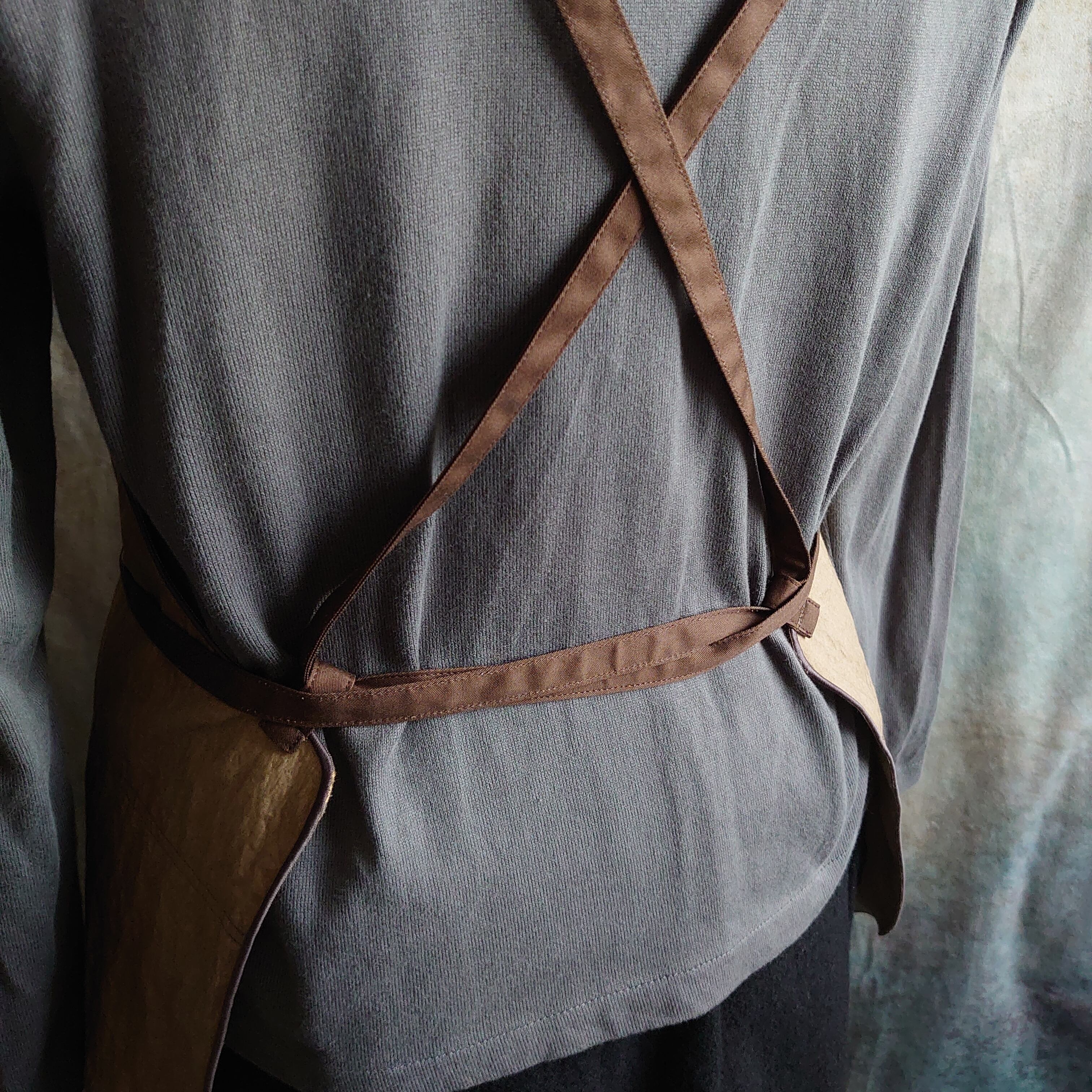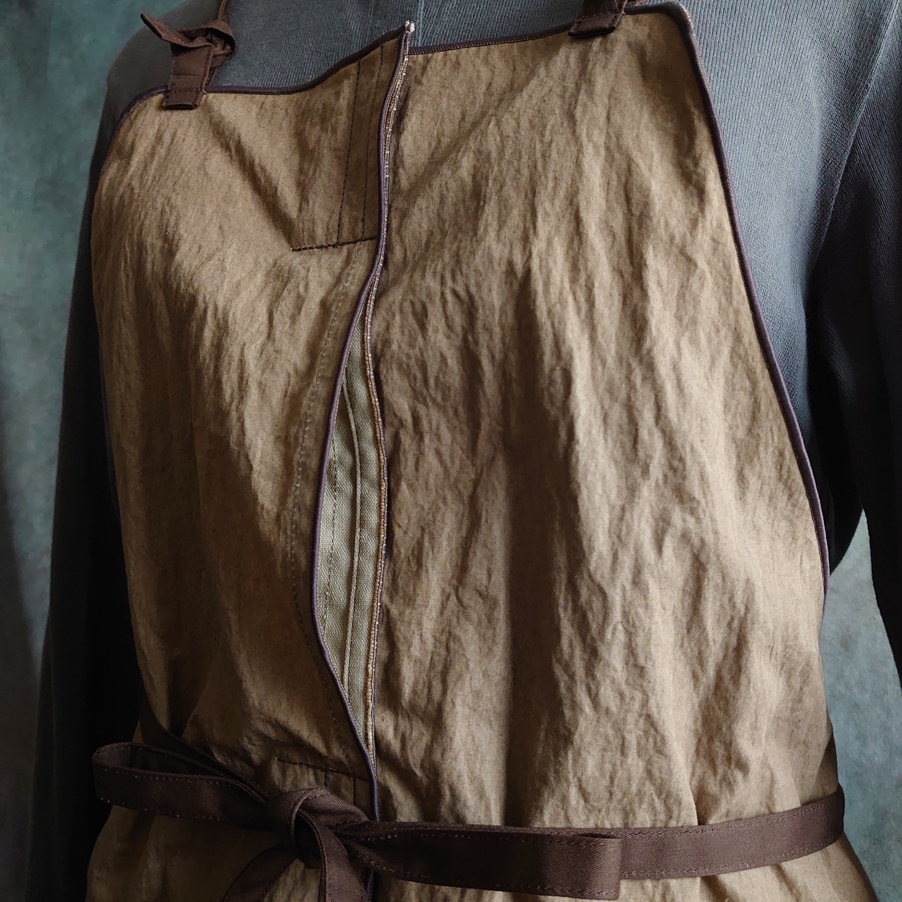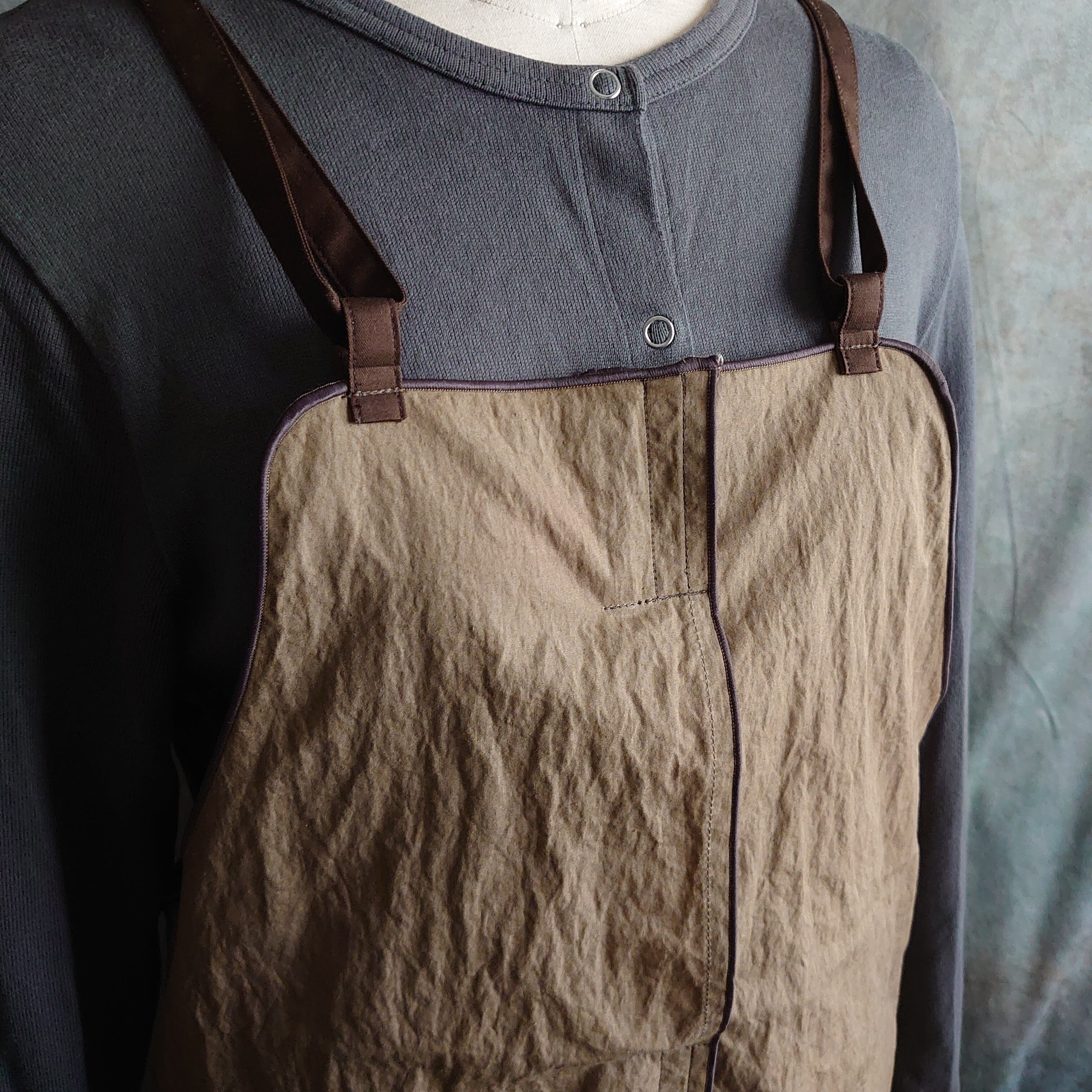 紐の片側を胸当て部分のループに結び、バッククロスさせてからウエスト部分のループに通せば、ゆったりめなウエスト結びができるタイプになるユニセックスデザインです。