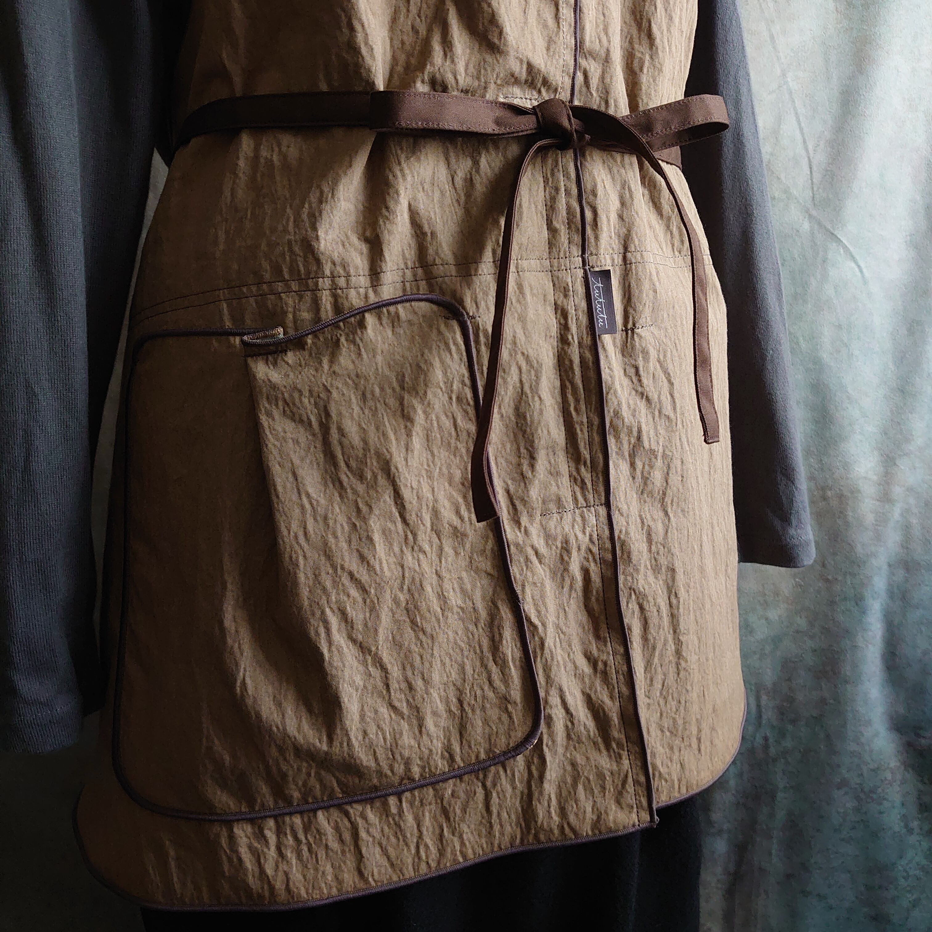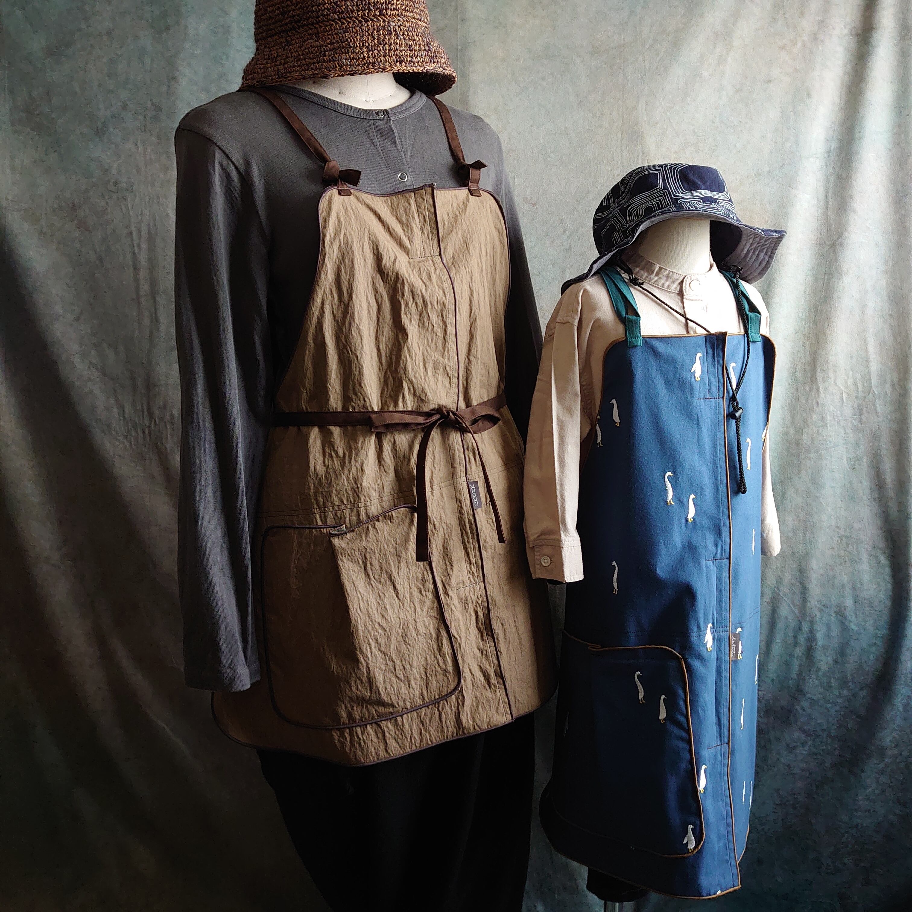 ころんと丸めのエプロンは、撥水加工生地、ナイロン混、絵柄の生地、コットンリネンなど、両面の素材も色も異なる生地を使用した選べるリバーシブルタイプ。